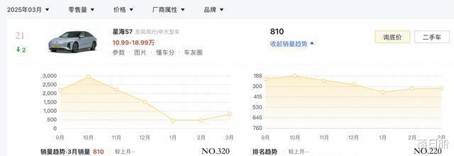 2025年3月,星海S7纯电版卖了810辆,这个销量算不上特别亮眼。