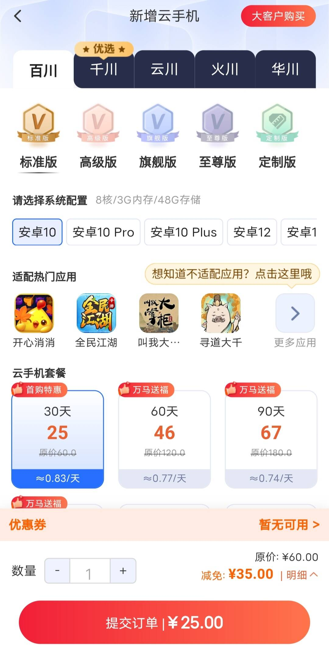星界云手机:我的预算范围内,居然没有我要的安卓10机型。它家安卓7“畅玩版”月卡要38元,8核处理器、4G运存、32G储存。系统版本过老,非常不推荐使用。