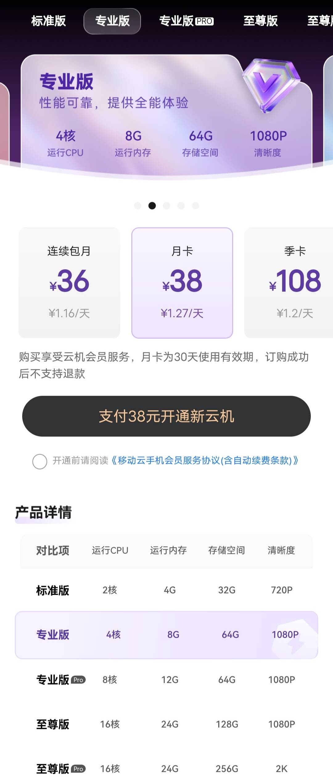 移动云手机:移动的,听着名头挺大,4核处理器、8G运存居然要38元一月。处理器明显是大短板,稍微大点儿的游戏都带不动,会不会卡顿更是不必猜了,我真想不明白它怎么敢标这么高的价。