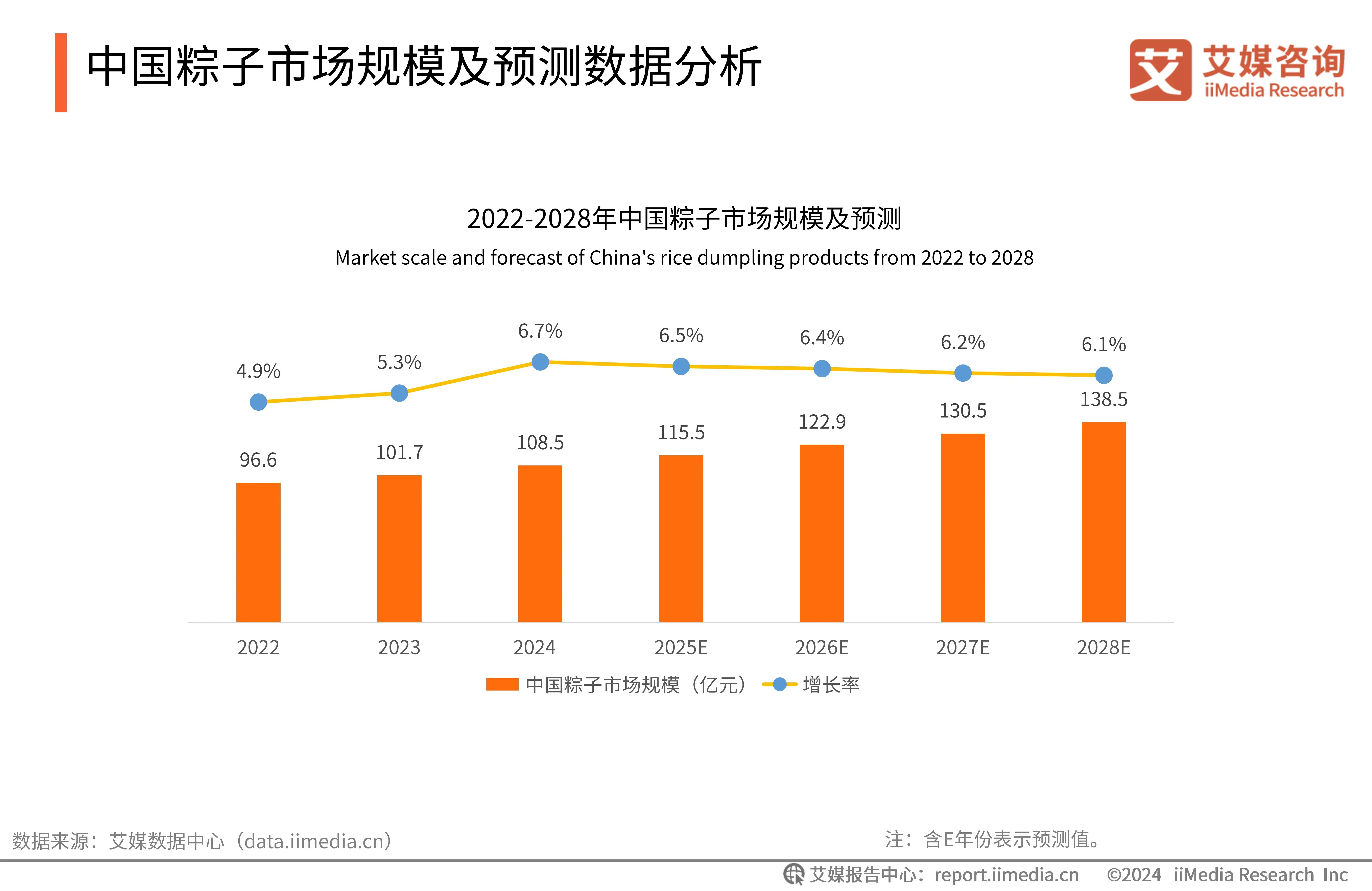 iiMedia Research(艾媒咨询)数据显示,2024年中国粽子市场规模为108.5亿元,同比增长6.5%;预计未来几年将保持6%以上的增长速度,到2028年有望达到138.5亿元。艾媒咨询分析师认为,随着传统文化的复兴和民众对传统节日的日益重视,粽子作为文化符号的价值愈发凸显。近年来,粽子企业在传承经典的同时,积极创新、融入现代元素,推出更多元化的产品,丰富了消费者的味蕾体验,助推粽子市场持续繁荣。