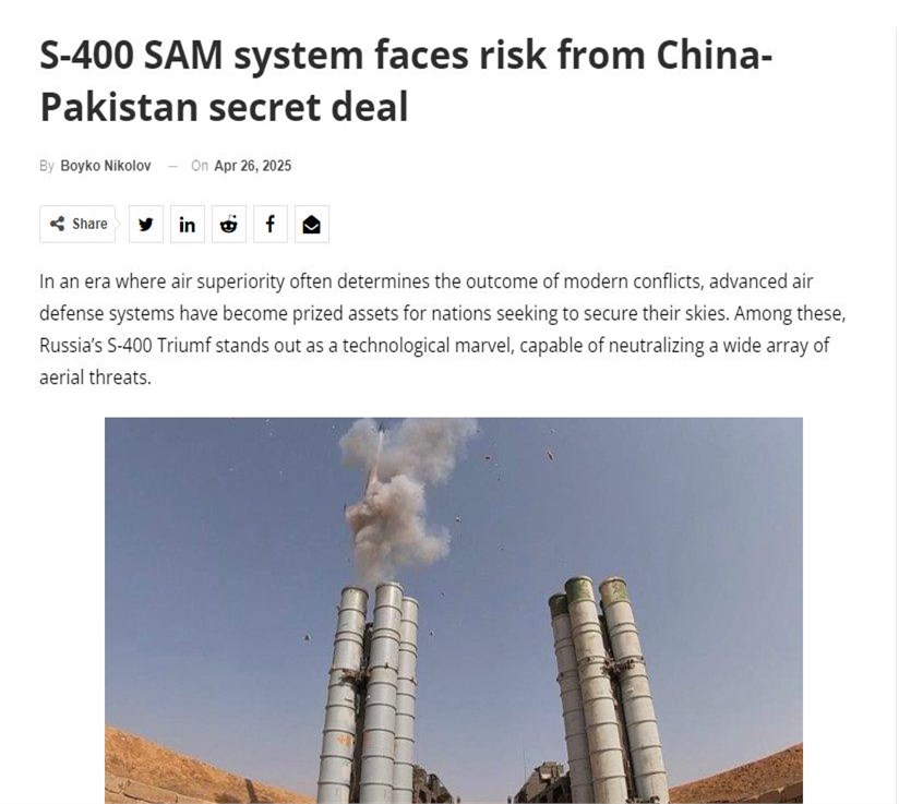 他们指出中国在获得S400以后,使得对该防空系统各型技术了如指掌,可能会帮助巴基斯坦开发电子干扰技术或类似于东风-17这样的高超音速导弹对抗印度的S400防空导弹系统,以削弱印度的防空实力。不过他们也明确指出,这只是猜测,并没有证据证明中国可能会向巴基斯坦分享这些敏感数据。
