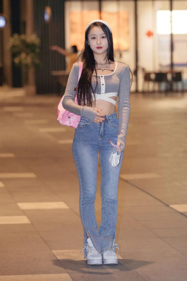 穿露脐衣搭配牛仔裤秀性感身材的时尚小姐姐