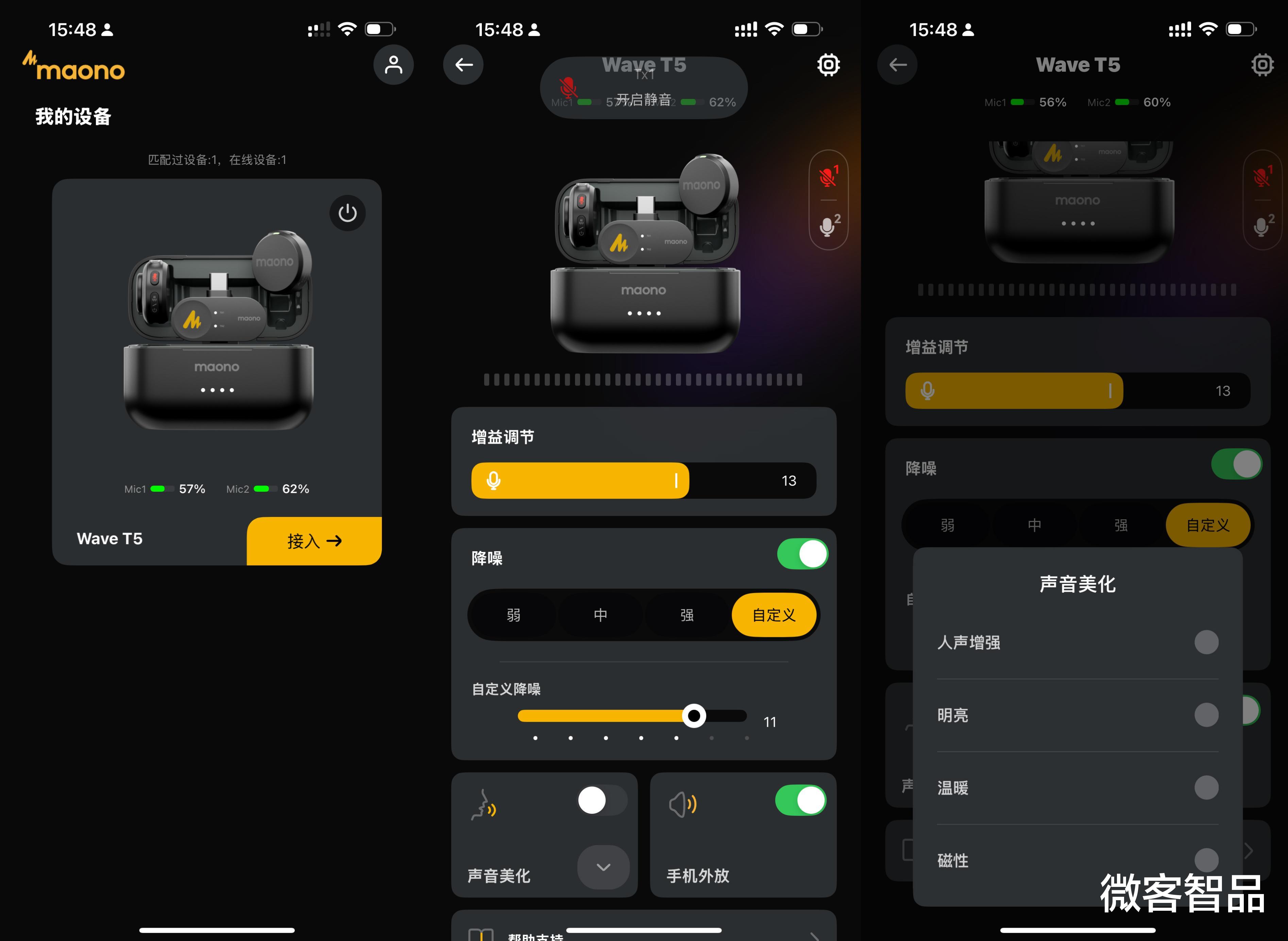 为了满足不同场景的使用需求,闪克 WAVE T5还带来了 4 种专业场景调音预设,无论你想要还原人声,还是让声音听起来更有电台感,包括人声增强,氛围感增强,通过maonolink软件都能一键切换,不仅降低了创作门槛,而且大大减轻了作品后期的工作量。