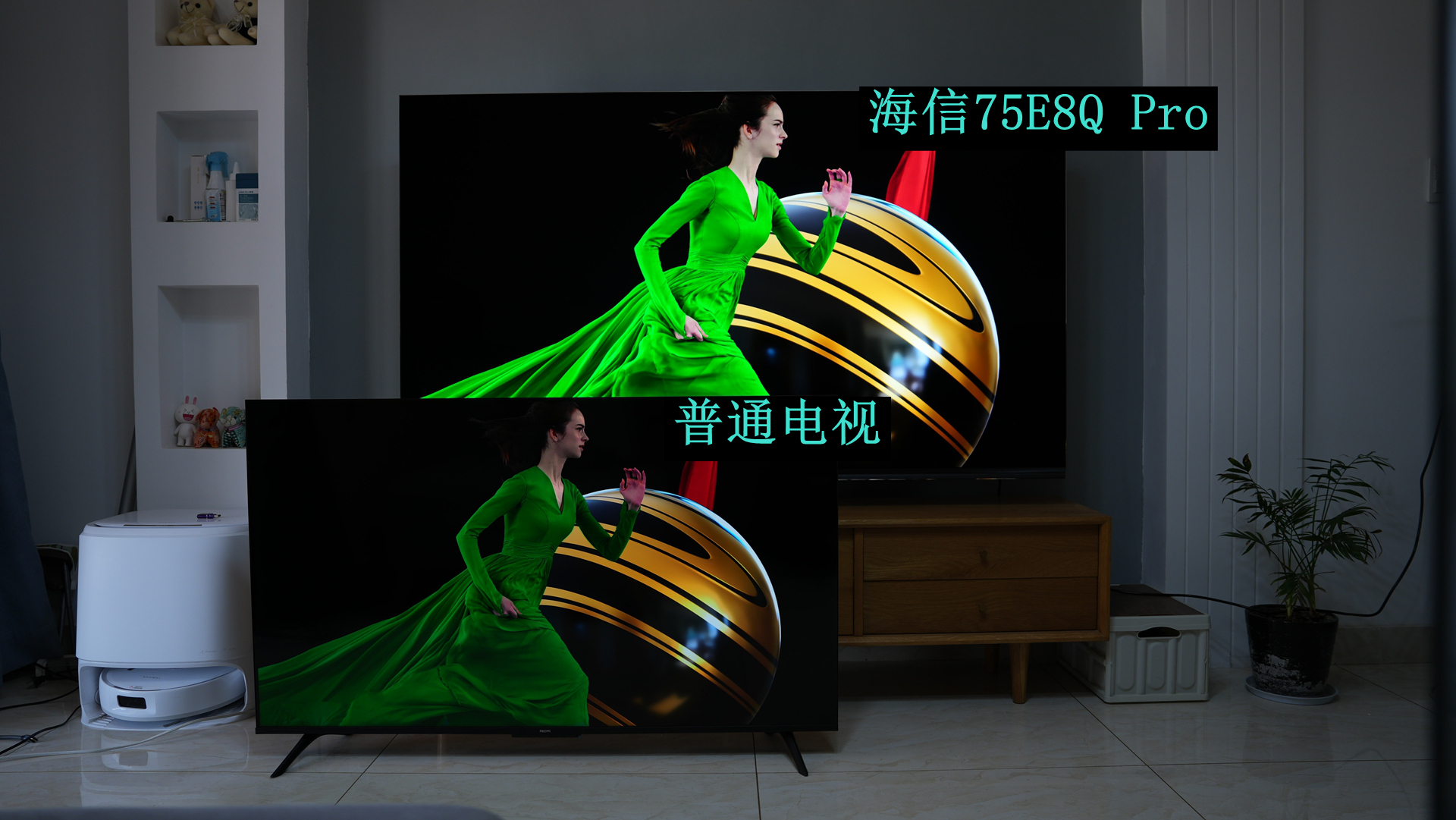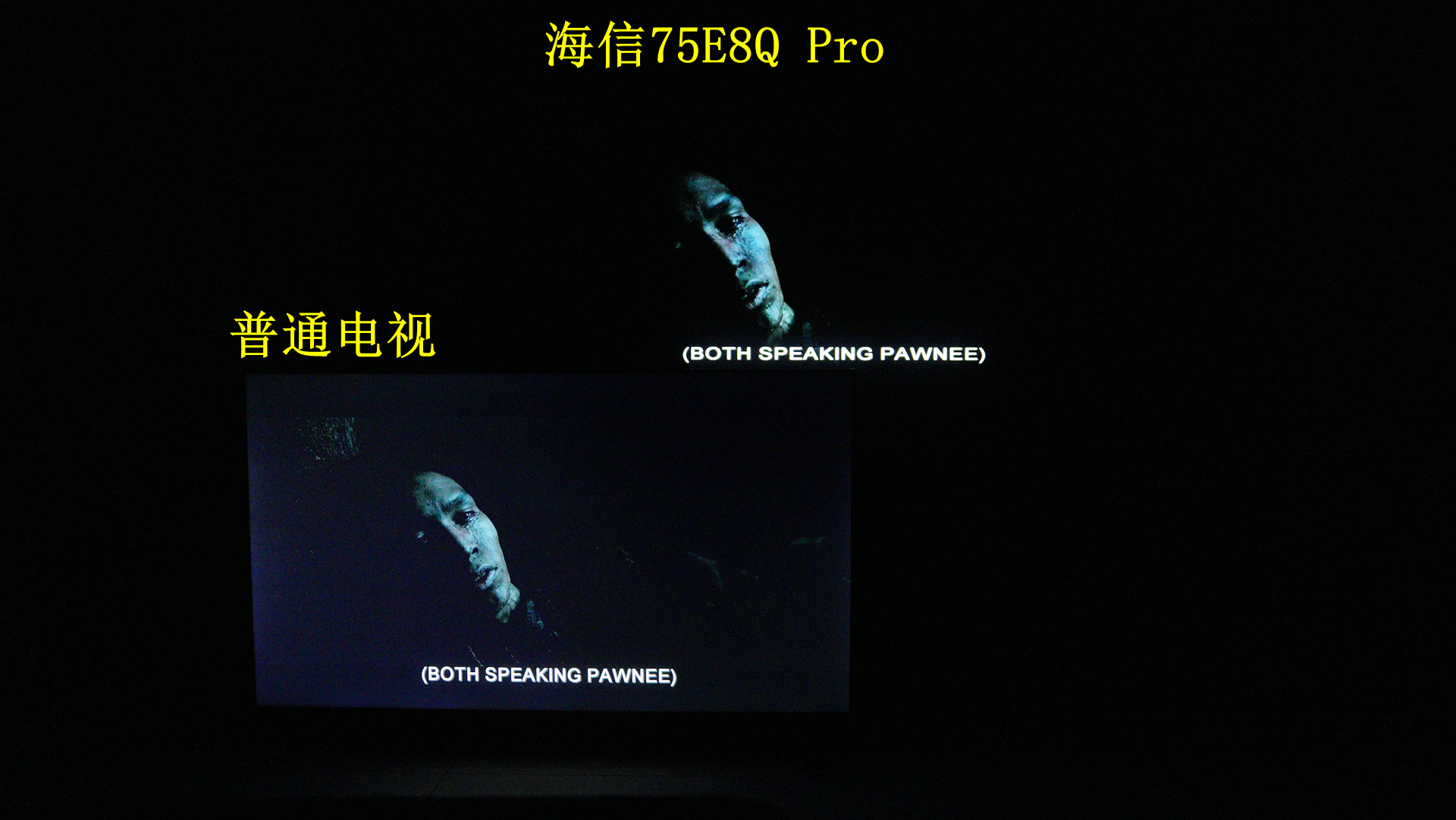 极致控黑:得益于分区和算法,与普通无分区电视同屏拍摄可见,海信75E8QPro有纯黑的观感。