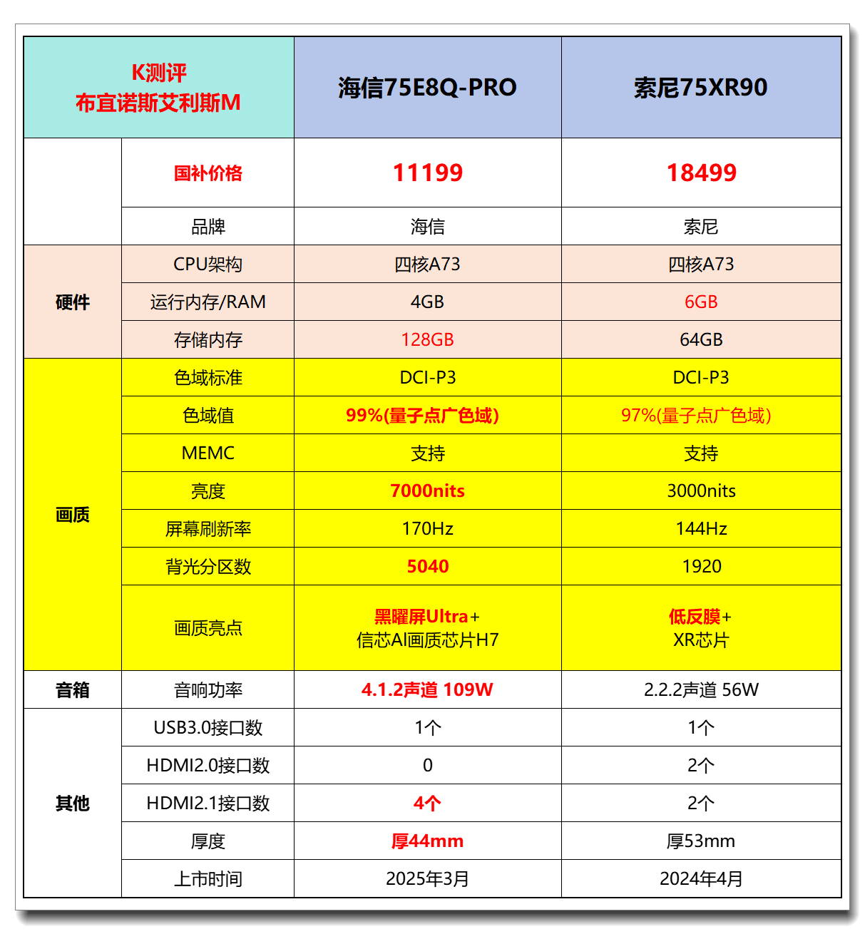 小结:海信75E8Q Pro经过实测,黑曜屏Ultra抗反射能力顶级+可视角度顶级+黑位顶级,超高峰值亮度、分区背光和量子点广色域在信芯 AI 画质芯片 H7的优化下,整体画面通透,颜色纯正,可以说是目前巅峰画质代表。