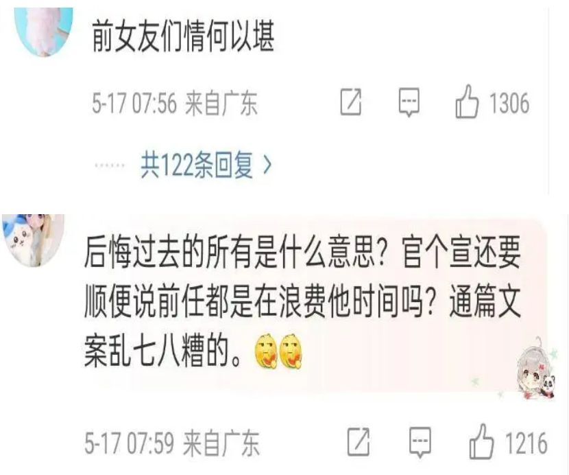 俞灏明选在“517”(谐音“我要妻”)官宣本寓意浪漫,但文案中“后悔过去的所有”却让网友炸锅。不少人指责:“结婚就结婚,拉前任垫背算什么?”更有粉丝替现任王晓晨抱不平:“新婚燕尔提旧爱,太下头了!”