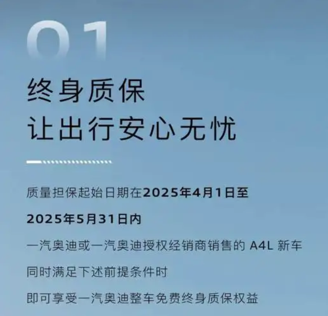 老牌燃油车巨头奥迪也没闲着。近日,一汽奥迪针对A4L 200万辆悦享版车型推出核心部件免费终身质保的限时政策,成为德系豪华品牌首个做出此承诺的车企。这不仅展现了一汽奥迪对自身产品耐久性和可靠性的高度信心,也打破了主流豪华品牌不敢触碰的服务边界,为进一步刺激燃油车的销量注入了动能。
