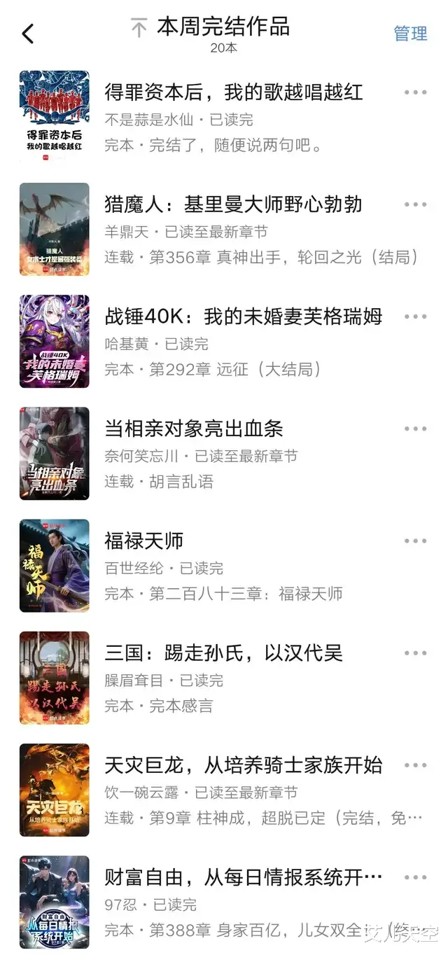 以上就是这周完结的一些小说了,或有遗漏,后面发现了下周补充。很多我也是浅尝辄止,大家有十分熟悉的,欢迎留言。