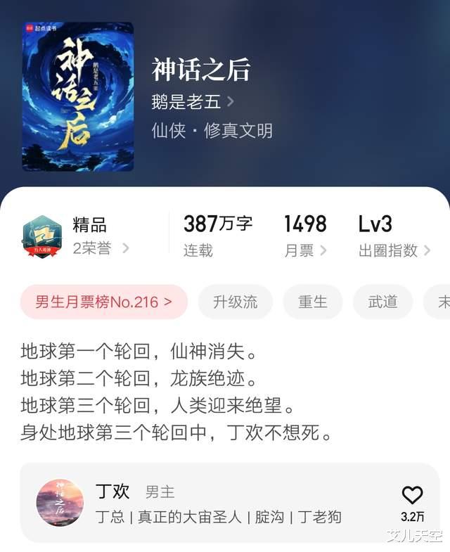 白金大神鹅是老五作品,《最强弃少》《不朽凡人》的作者,虽然不在巅峰期了,不过后面作品也都能写到万订。在一众大神里也是非常稳的。