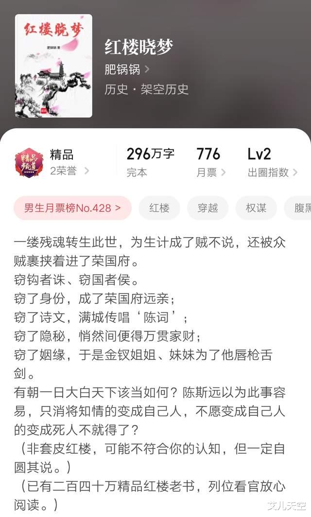 肥锅锅作品,《红楼华彩》作者,依旧还是红楼梦同人,邢夫人外甥开局,从扬州过来投奔,由此开始的红楼故事,精品线成绩。