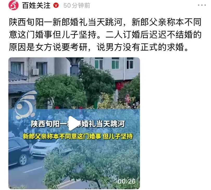 【陕西旬阳一新郎婚礼当天跳河,新郎父亲称本不同意这门婚事但儿子坚持。二人...】