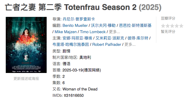 依然是6集体量,短小精悍,没有狗尾续貂,亮点依旧出彩,观看量也是依旧冷门——《亡者之妻》第二季。