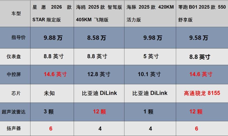 虽然说零跑B01的定位更高一些,但是目前零跑家族在年底可是拿出了众多优惠政策,其中除了现金补贴、金融补贴、换购补贴等等,整车的裸车价格来到了8万多点,整体而言价格上,也没有比吉利星愿、比亚迪海鸥、海豚等车型贵多少,那这四款车到底如何选,才不算踩坑呢?