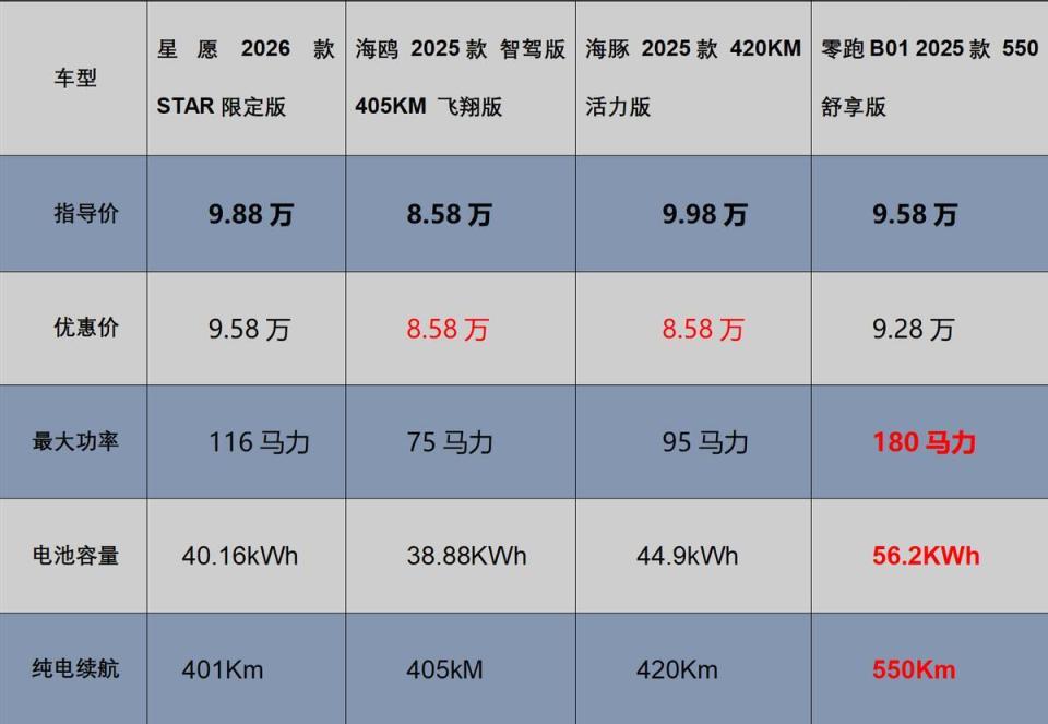 如果说自己的预算只有5万—10万,这四款车型确实都是蛮不错的,毕竟背后的品牌实力都足够强大,但是通过从今天的横向对比来看,如果想要长续航、高配置、智能化强的纯电车,当下的零跑B01显然是比星愿、比亚迪海鸥、海豚更好的选择,而且要知道,零跑B01除了有3000元的补贴外,还有至高5000元金融补贴以及本品赠换购补贴4000元等权益,如果说可以加点预算,在10万出头的价格就能够买到零跑B01的650Km版本或者550带激光雷达的版本,不得不说诚意这一块,还是零跑给的足,这也是为何零跑在11月份热销7万多台的主要原因。