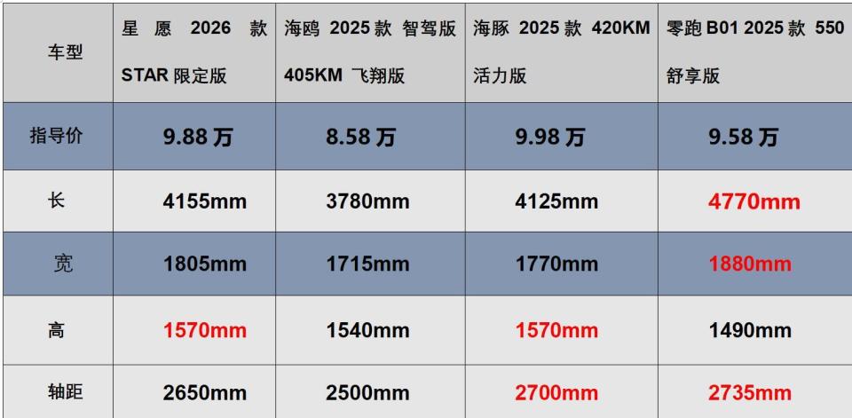 今天我们指定的这四款车,都是10万以内的代步车,我们都知道,国人对于大空间车型的喜爱度是非常高的,但是往往代步车都没有很好的空间表现,吉利星愿、比亚迪海鸥、海豚都是小型车,车身长度都没有达到4米2,而零跑B01定位是紧凑级轿车,在这个价格区间的空间还是很有优势的,毕竟4770mm的车身长度和2735mm的轴距表现,在紧凑级轿车里面都是很有优势的。