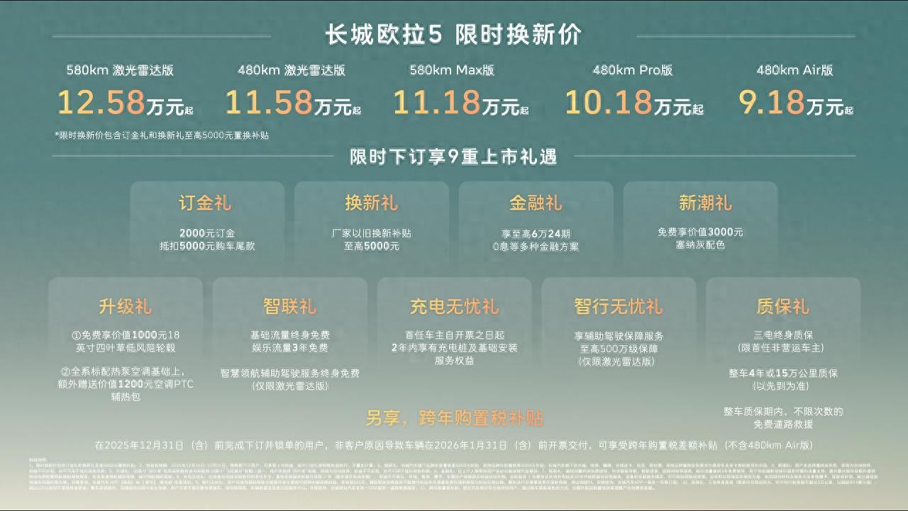 【中国·保定】2025年12月16日——今日,长城汽车欧拉品牌全新A级纯电SUV——长城欧拉5正式上市。新车共推出5款配置,建议零售价区间为 9.98万至13.38万元,限时换新价9.18万元起(限时换新价包含“订金礼”和“换新礼”至高5000元以旧换新补贴)。为回馈广大用户的热爱与支持,即日起至2025年12月31日,用户下订并锁单即可尊享包含订金礼、换新礼、智行无忧礼在内的9重上市好礼,以及跨年购置税补贴(不含480km Air版)等丰厚购车权益。凭借诚意十足的价格权益与越级产品力,长城欧拉5致力于成为全球年轻用户的“严选搭子”。