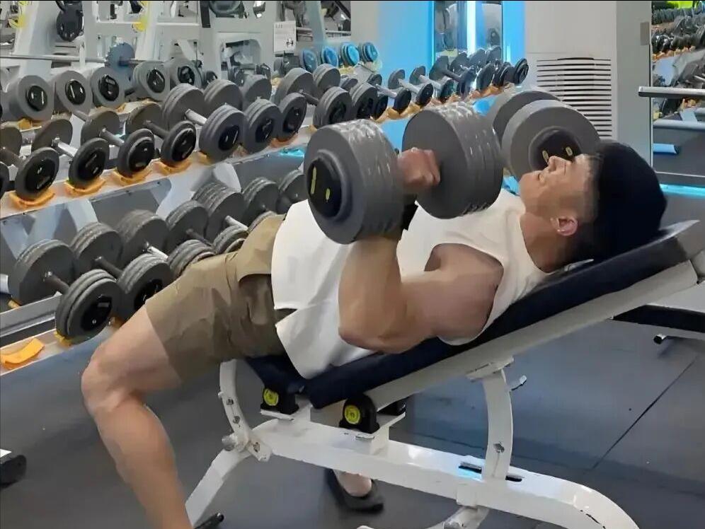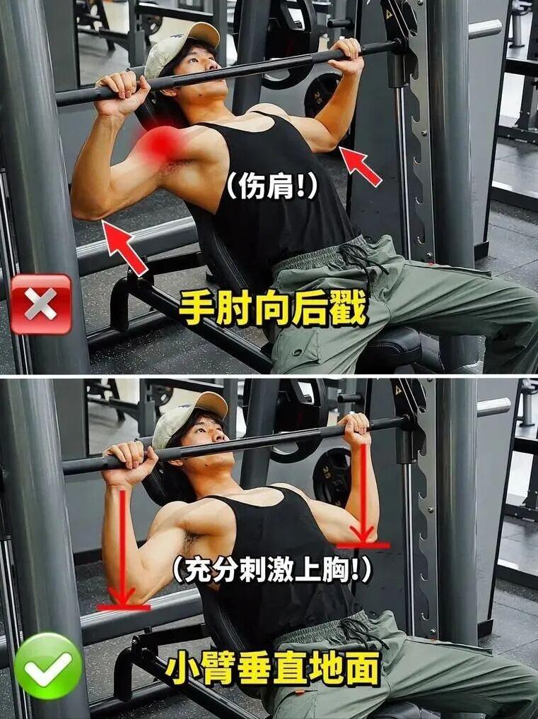 卧推凳倾斜30~45°,杠铃下放至锁骨位置,手肘朝脚的方向内收,顶峰时夹紧胸肌停顿1秒。