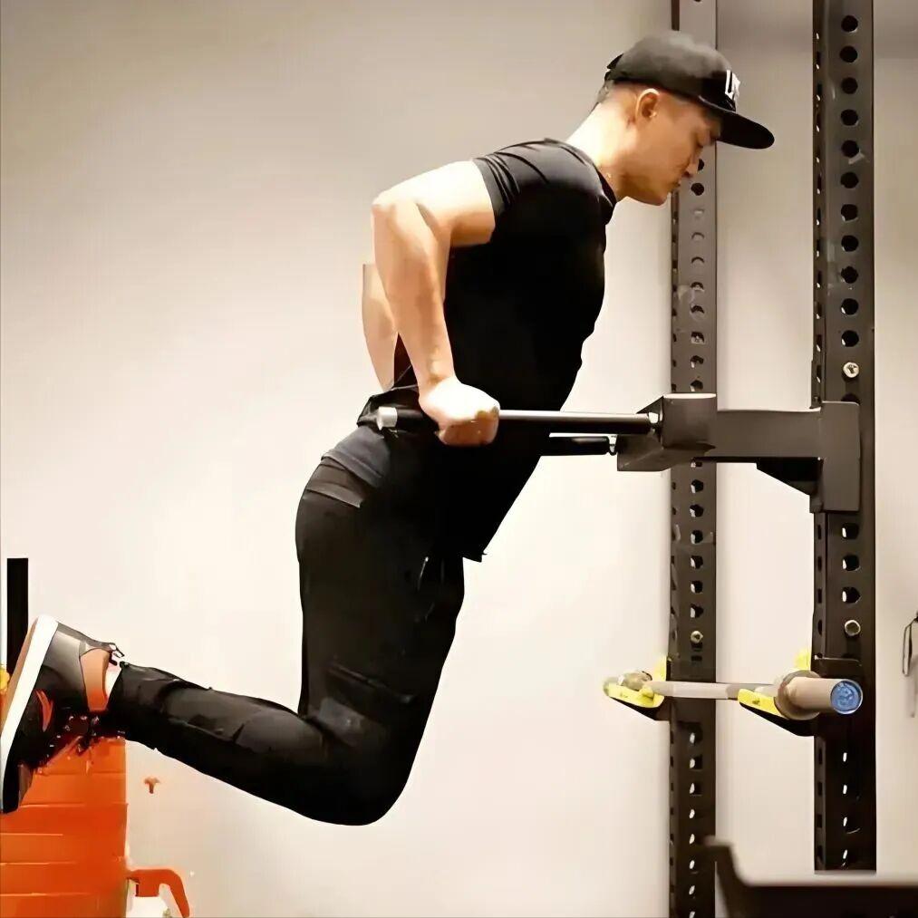 双手握双杠(宽距),身体前倾30°,手肘朝外后方打开,下放至上臂与地面平行(或胸肌有强烈拉伸感),推起时呼气,核心收紧杜绝身体晃动。➡训练量: