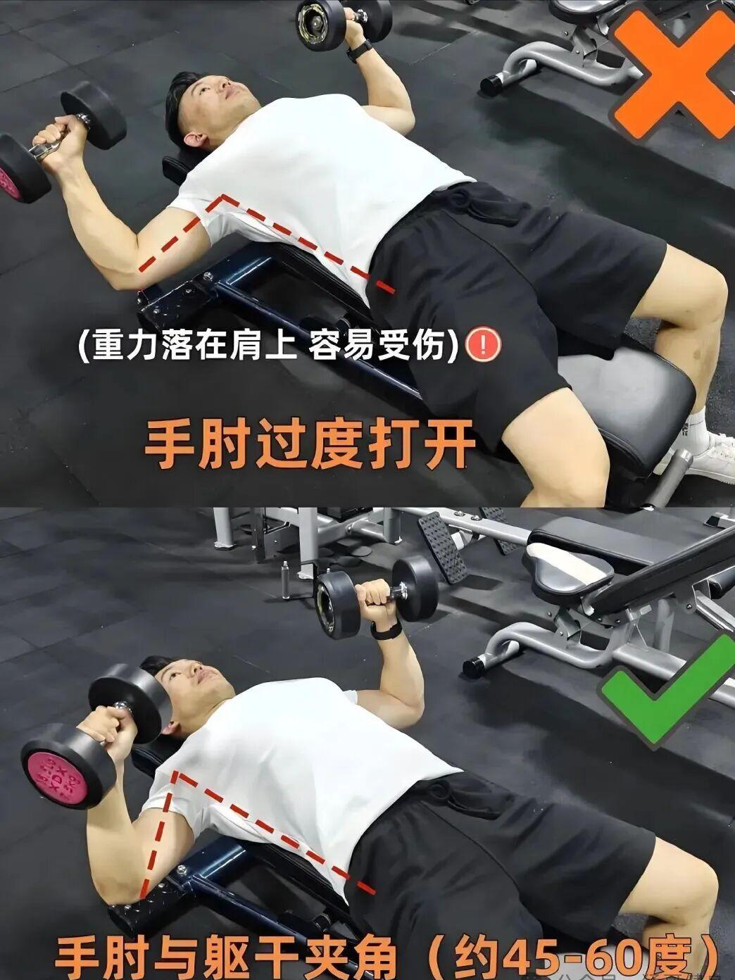 平躺在卧推凳上,双脚踩实地面,手肘与身体保持45~75°夹角,哑铃下放至胸侧,停顿1秒感受胸肌拉伸,推起时肘关节不锁死,保持持续张力。