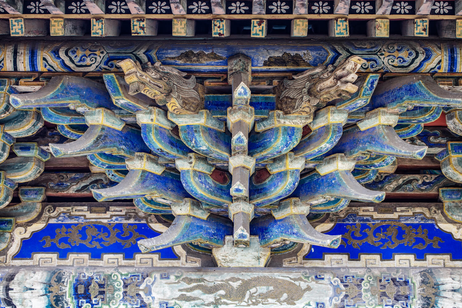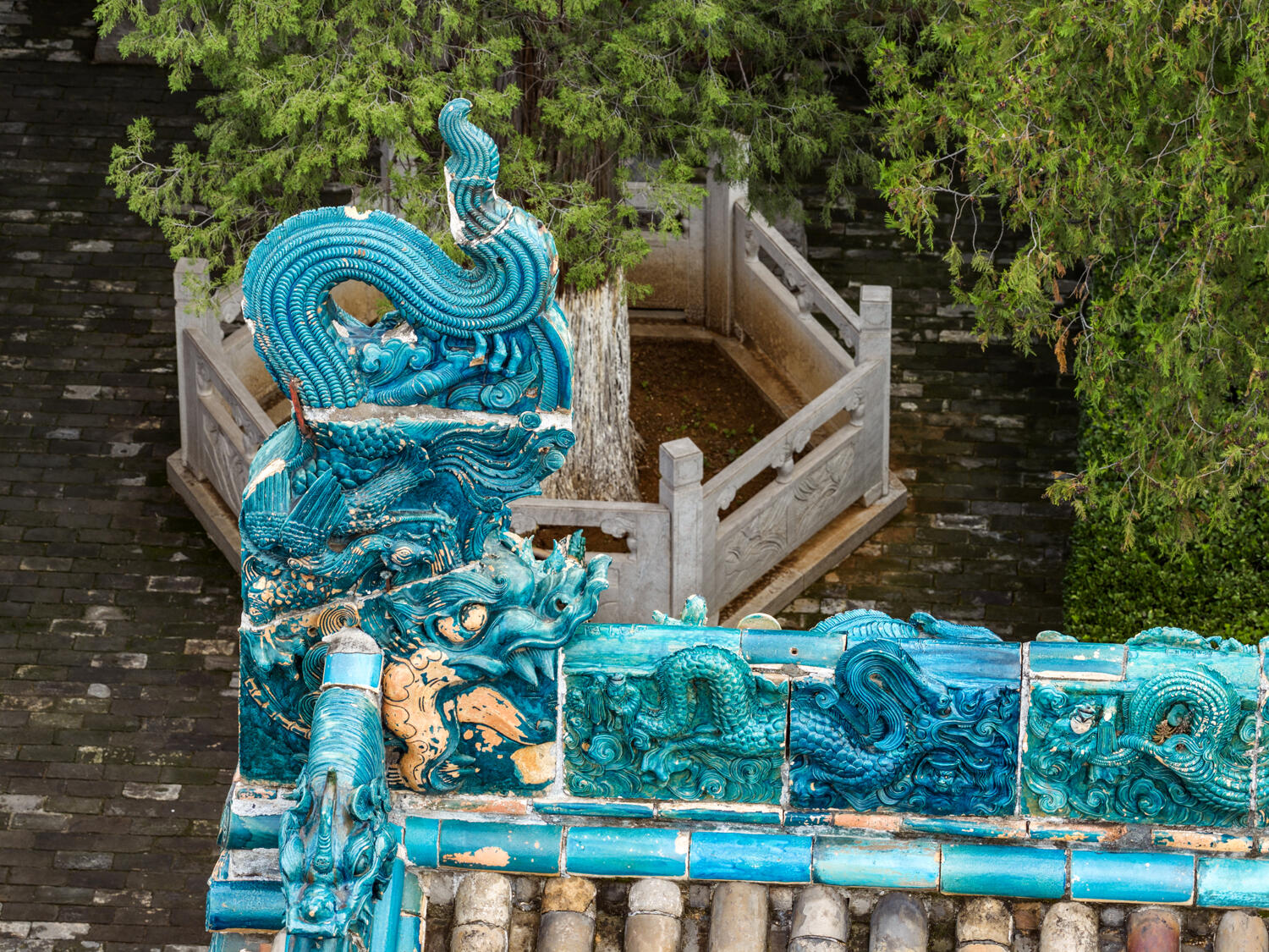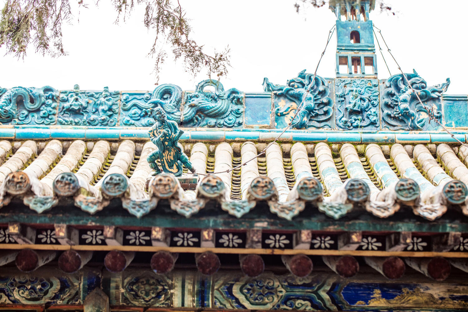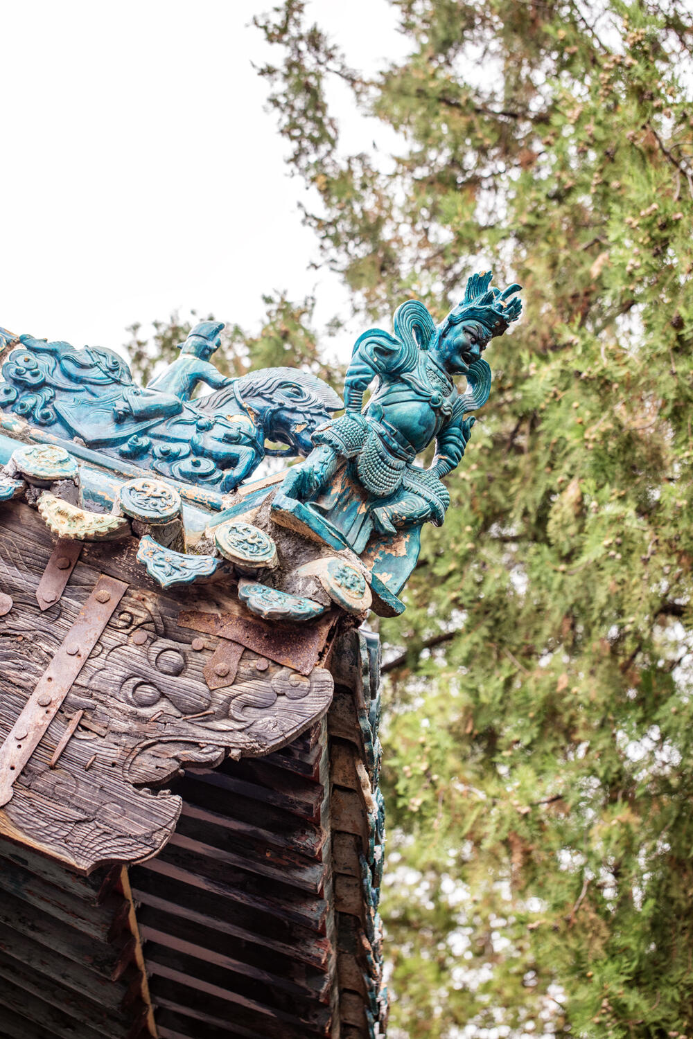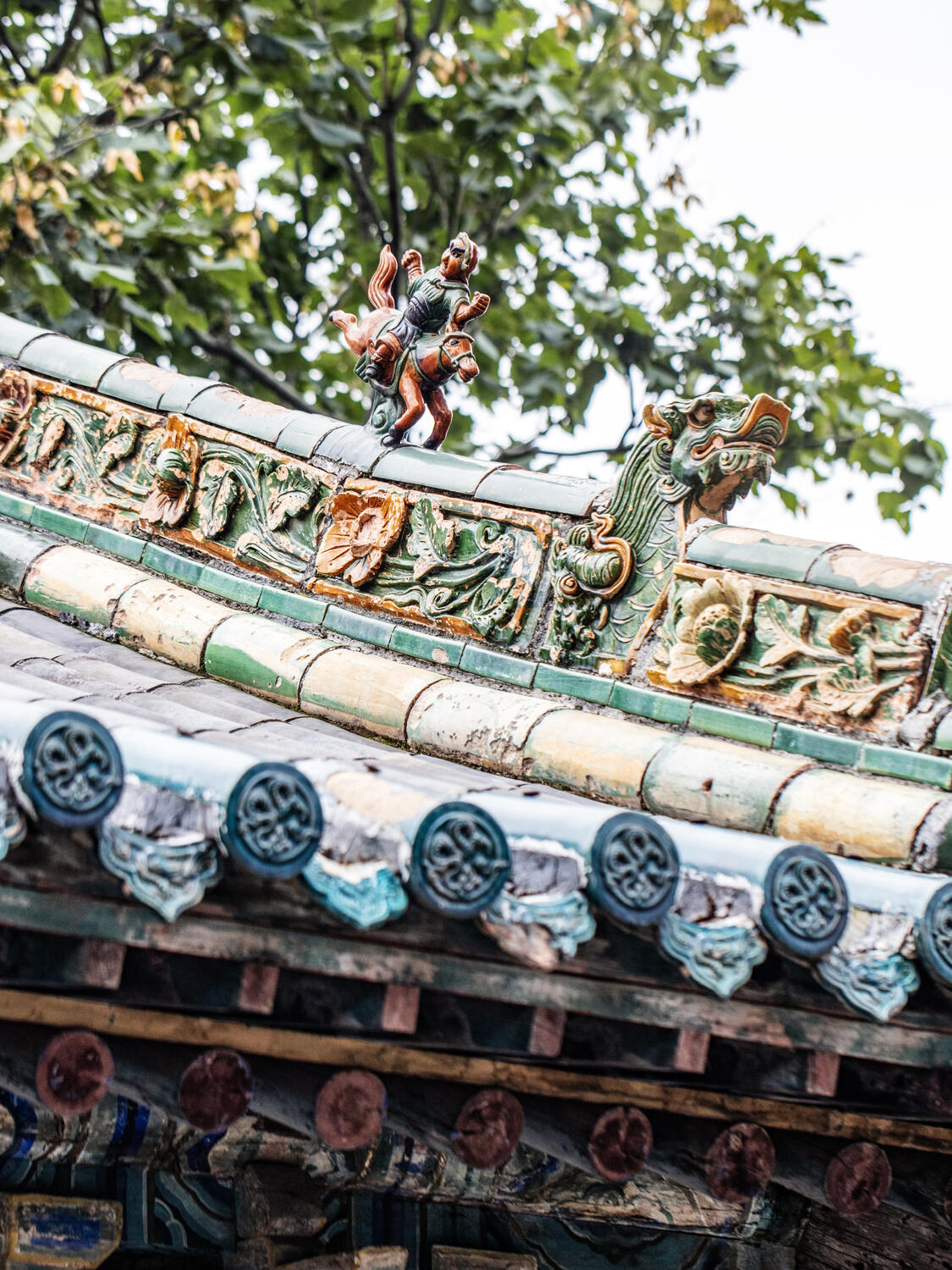 再看垂脊,上面堆塑的牡丹花太逼真了。花瓣一层叠一层,最外层的花瓣微微向外翻,像是刚绽放开来,花瓣的边缘还描了一圈浅黄,让蓝色的琉璃多了点暖意。垂脊头部立着的龙头和骑马仙人更有意思,龙头张着嘴,像是在长啸,马的鬃毛飘着,仙人坐在马上,手里握着缰绳,连衣袍的褶皱都清晰可见,远看像真有人骑着马站在那里,要顺着垂脊往下走。