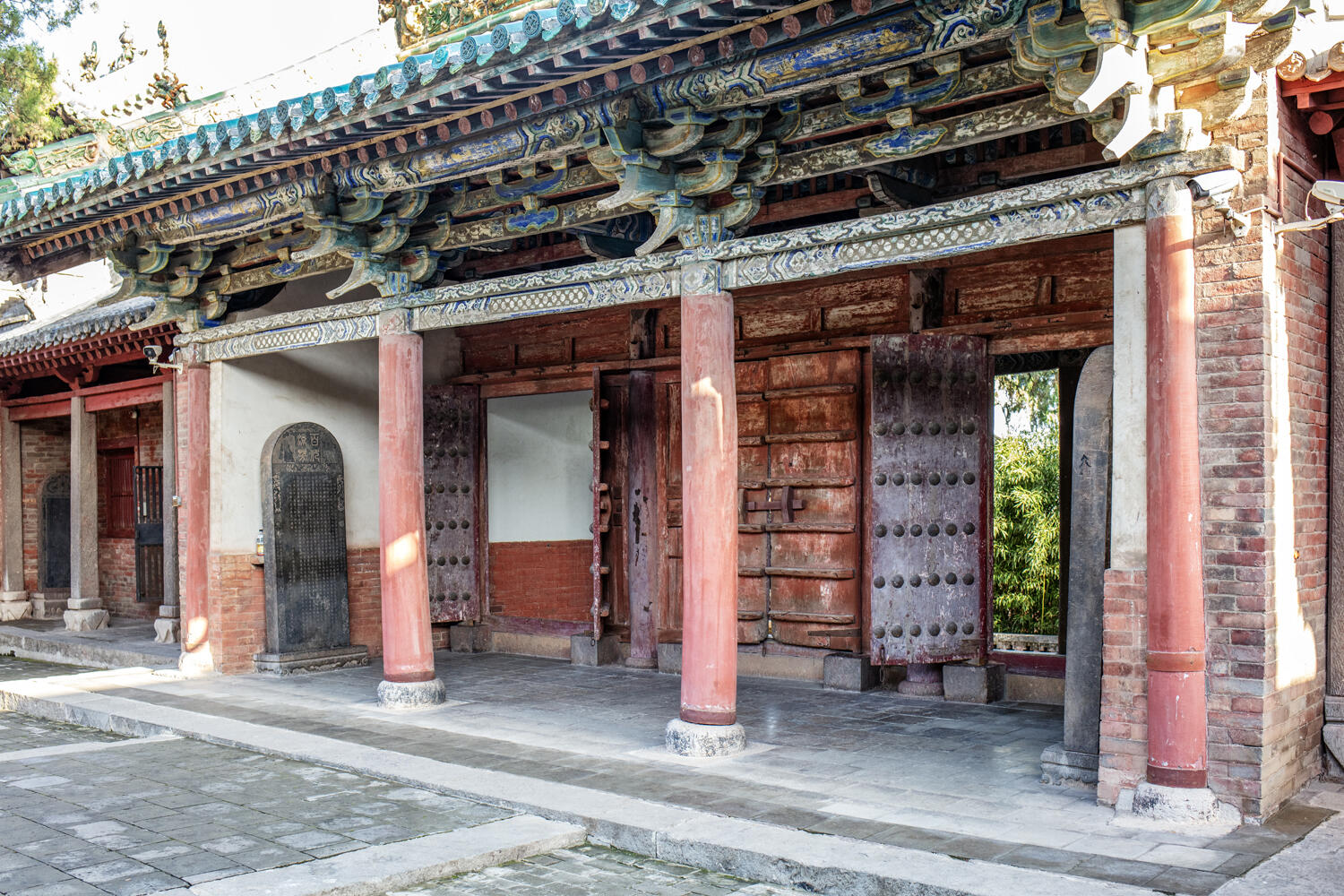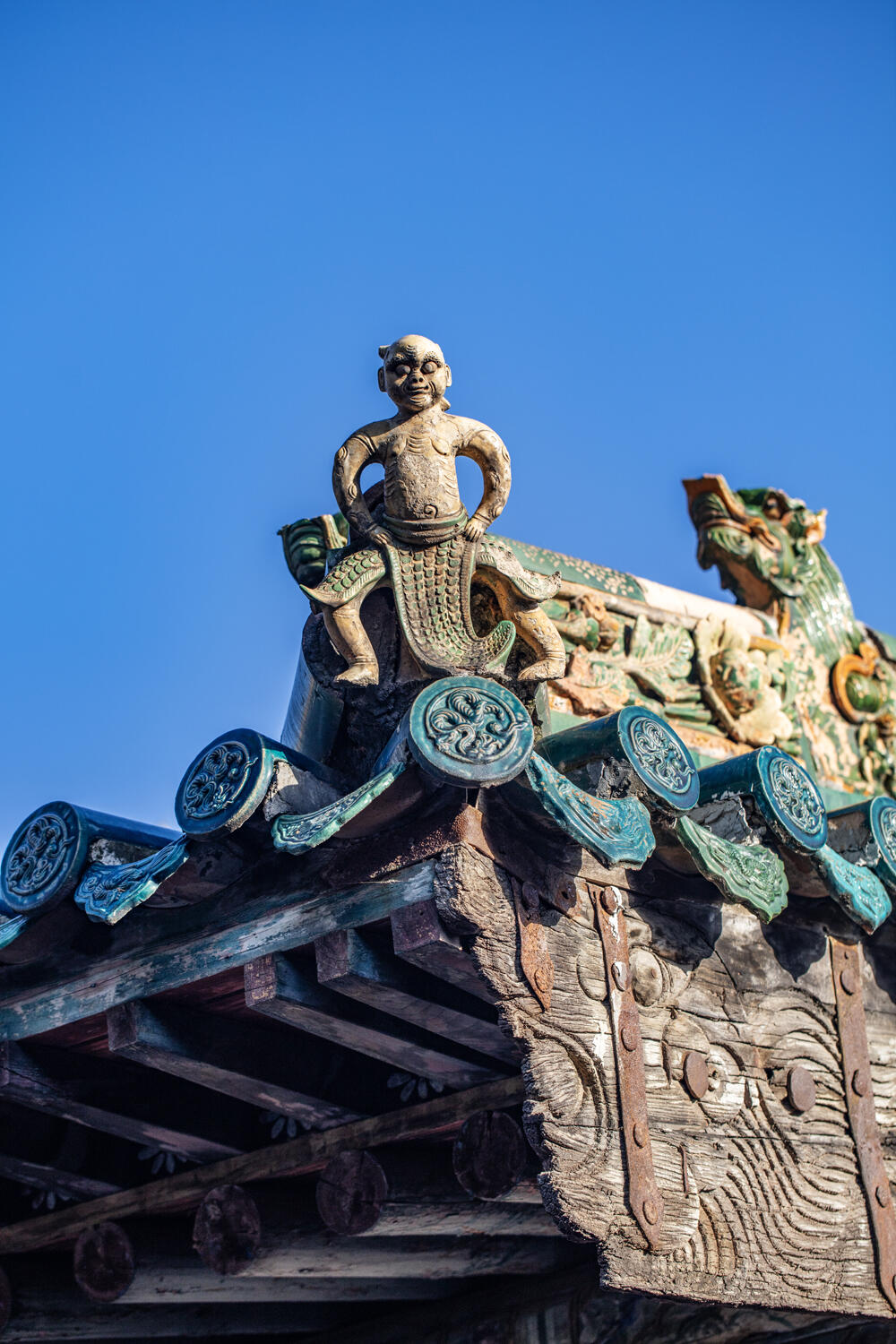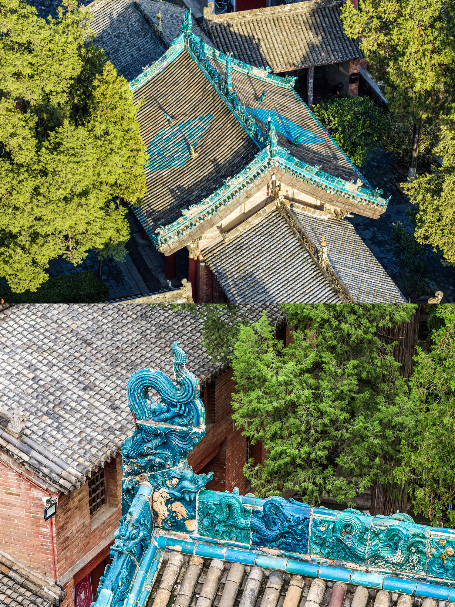 现在每次来这里,都会看到有人拿着相机,对着孔雀蓝琉璃脊饰拍个不停,也有人站在二道山门前,对着斗拱的结构比划,还有人指着八仙的雕像,和同伴争论哪个最像。有时候会想,几百年前建这两座山门的工匠,会不会想到,几百年后会有这么多人围着他们的作品,细细琢磨每一个细节?他们在烧制孔雀蓝琉璃的时候,是不是反复调试了配方,才调出这么特别的颜色?在雕刻八仙的时候,是不是特意观察了生活中的人,才让每个仙人都有了自己的神态?