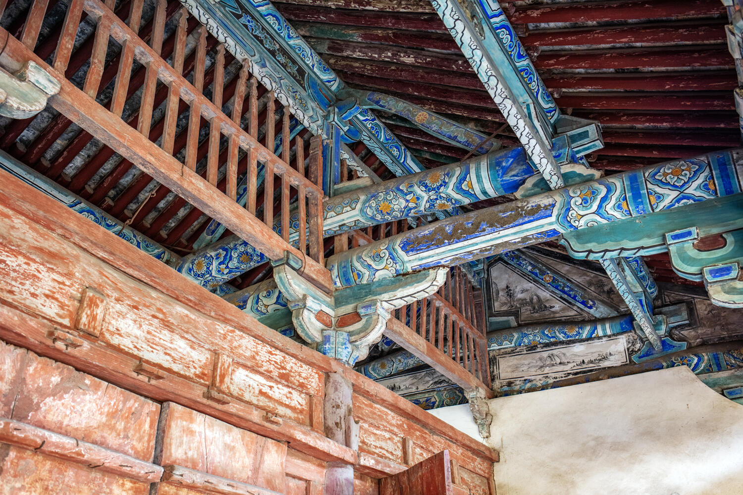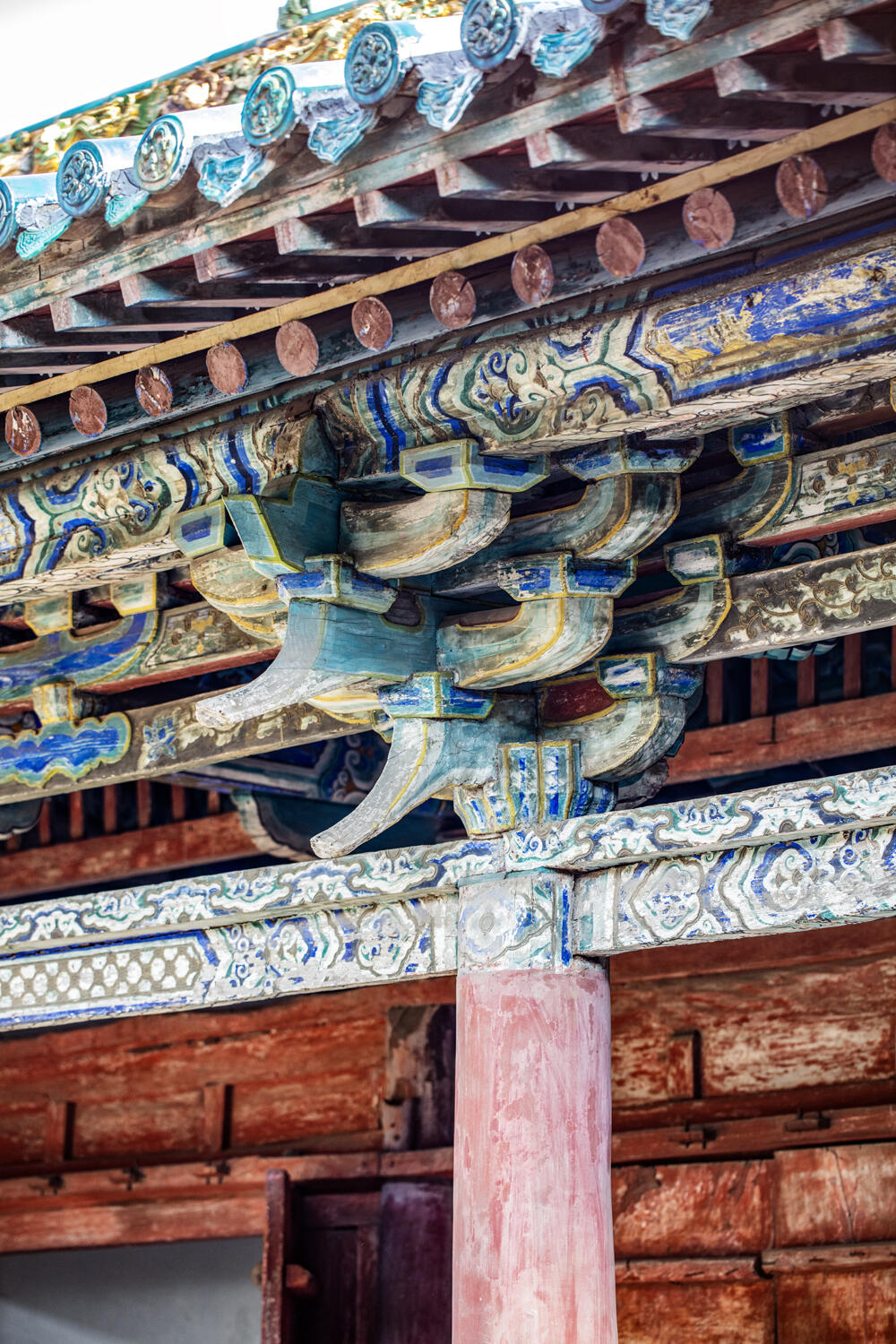 绕过头道山门往后走,就是元代至元年间建的二道山门,风格和前一座截然不同,却同样让人惊艳。这座山门也是面阔三间,进深四椽,内部用的是“前后乳栿对接中柱头斗拱”的结构,通檐同样靠三根柱子支撑,单檐悬山顶看着朴素,细节却不含糊。前檐用的是方石柱,柱头的斗拱是单杪单下昂五铺作,里转是五铺作偷心造,那些木构层层叠叠,像搭积木似的,却搭得极精准,没一点偏差。后檐换成了圆木柱,柱头斗拱变成了双下昂五铺作,里转还是五铺作偷心造,方柱与圆柱的切换,单昂与双昂的变化,看着简单,实则藏着工匠对结构的精准把控。