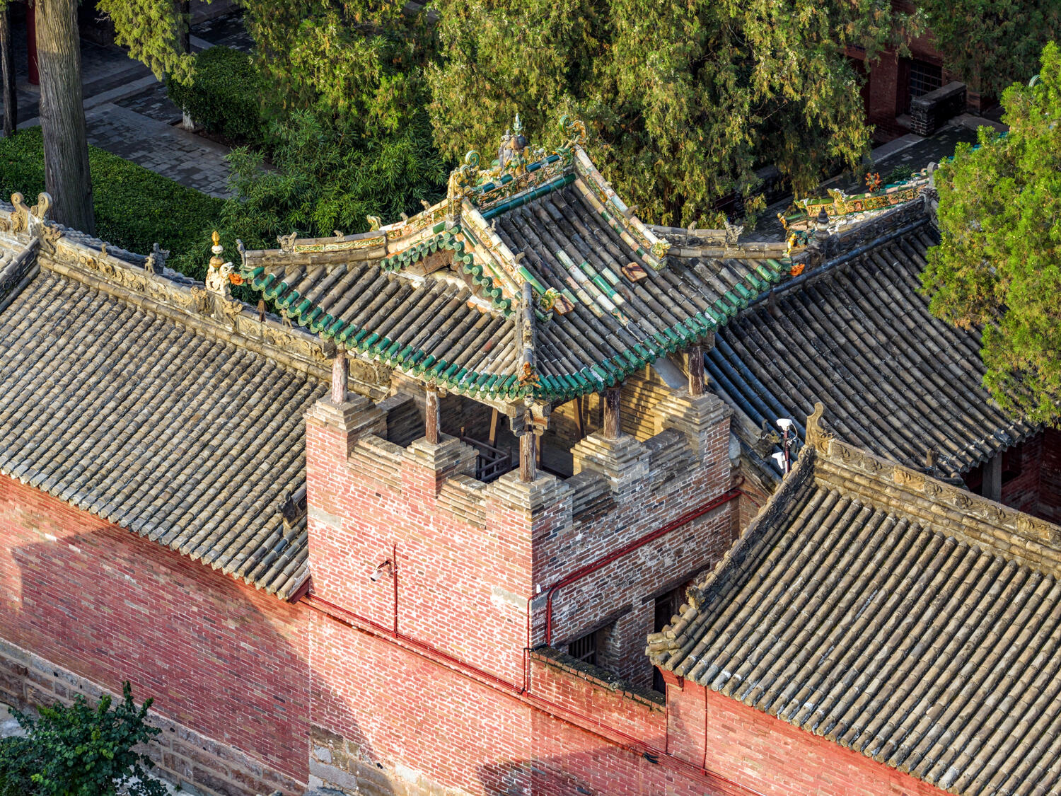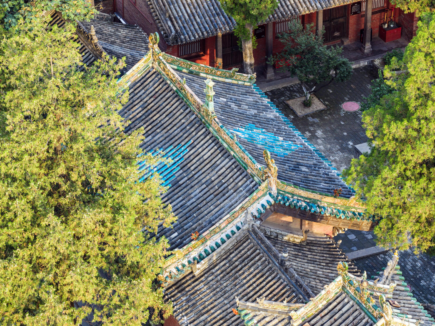 走到泽州玉皇庙门口,还没看清山门全貌,先被一片亮眼的蓝拽住了脚步——那是头道山门屋顶的孔雀蓝琉璃脊饰,在太阳底下泛着光,不是单调的深蓝,是蓝里透着点灵动的绿,像把孔雀开屏时最艳的那片羽毛,直接铺在了屋脊上。凑近些看,琉璃的表面还能映出天上的云影,风一吹,云影在脊饰上轻轻晃,倒像是那抹蓝活了过来,要顺着屋脊往下流。