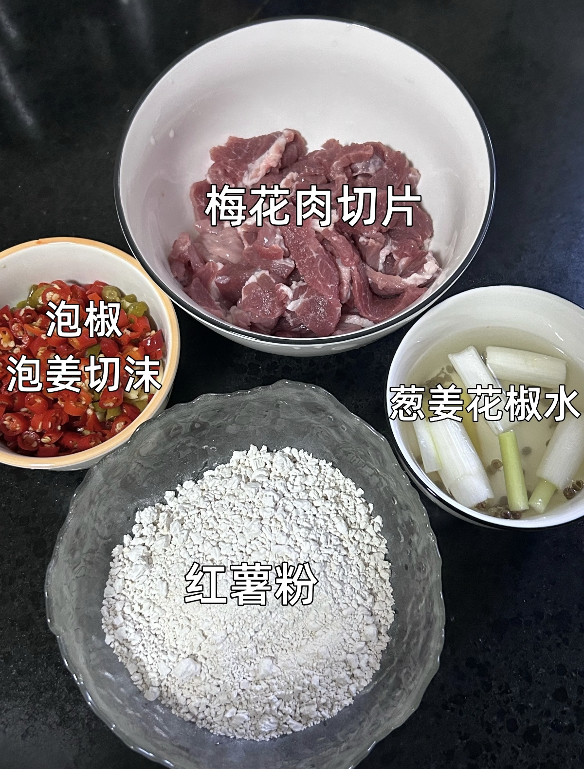 准备食材时要格外用心,300克梅花肉切成均匀薄片,带点肥的部位煮后更显嫩滑,不会发柴。红薯粉是这道菜的灵魂所在,得用纯红薯淀粉,才能调出足够黏糯的粉糊。提前泡好葱姜花椒水,葱的清香、姜的辛辣与花椒的麻香慢慢融入水中,是让肉片去腥增嫩的关键。泡椒和泡姜要仔细切碎,红亮的泡椒带着发酵后的鲜辣,泡姜则多了几分醇厚的姜香,再备上一勺豆瓣酱,红油与咸香的基底便有了雏形。少许盐、生抽、老抽和鸡精,简单的调味就能勾勒出层次丰富的味道,不用过多调料,反而能凸显食材本身的鲜美。