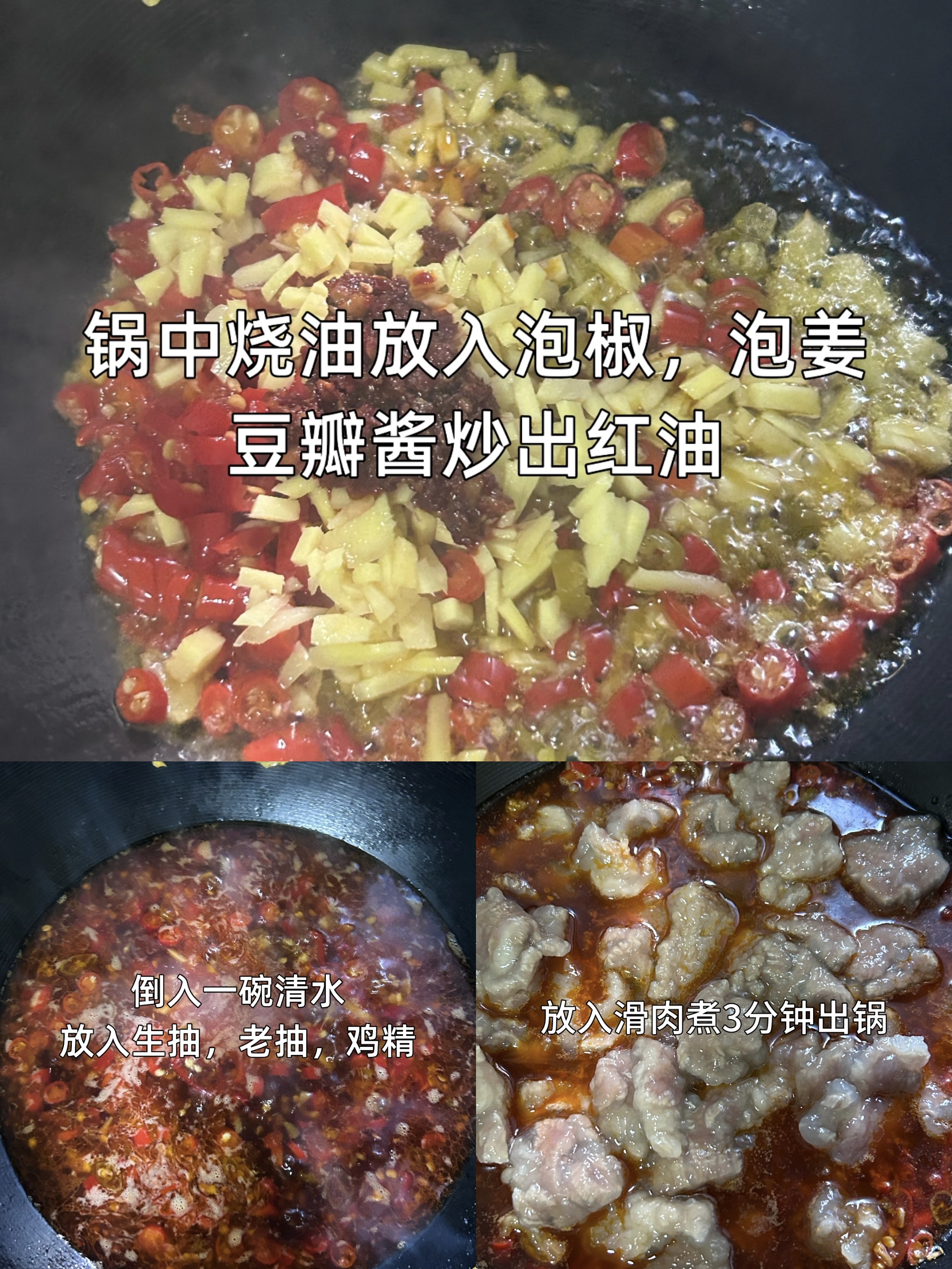 炒制底料时,锅中倒入适量食用油,烧热后转小火,放入切碎的泡椒、泡姜沫和一勺豆瓣酱,慢慢翻炒出红油。小火是关键,能让香料的香味充分释放,又不会炒糊发苦,红亮的油光慢慢泛起,酸辣的香气瞬间弥漫整个厨房,光是闻着就让人食欲大开。接着倒入一碗清水,加入生抽提鲜、少许老抽调色、鸡精增味,待汤汁烧开后,放入过凉水的滑肉,小火慢煮三分钟,让酸辣的汤汁慢慢渗入每一片肉中,味道便彻底融合。