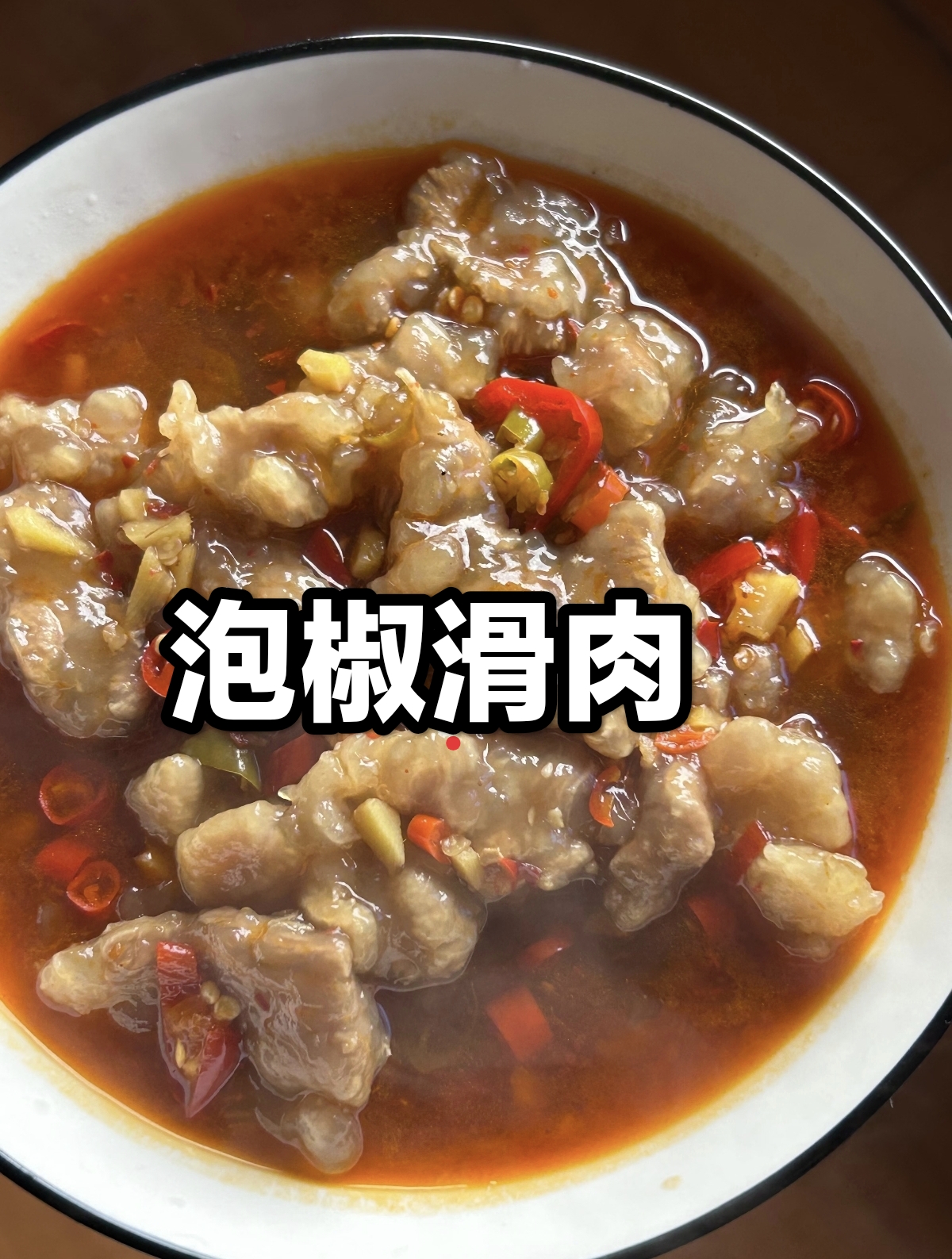 出锅的泡椒滑肉盛在白瓷碗中,红亮的汤汁裹着嫩白的肉片,点缀着细碎的泡椒与泡姜,光是看着就令人垂涎。夹起一片放入口中,软嫩的肉片带着微微的弹性,酸辣的汤汁在舌尖迸发,既有泡椒的鲜爽,又有泡姜的醇厚,还有豆瓣酱的咸香,层层递进的味道在口腔中蔓延,配着一碗白米饭,能让人不知不觉多吃两碗。