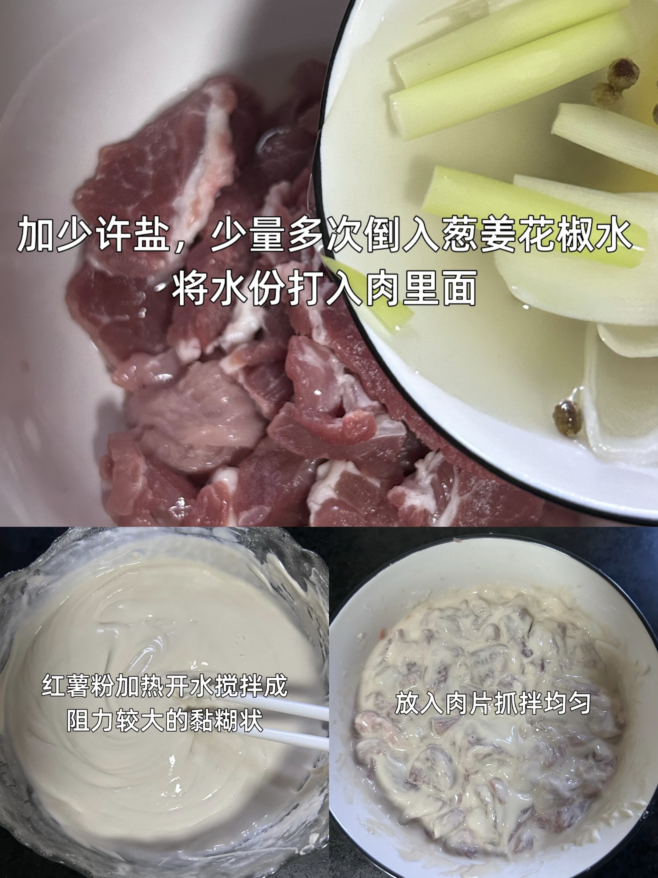 腌制肉片是决定口感的核心步骤,先在梅花肉片中撒入少许盐,轻轻抓匀给肉片打底味,接着少量多次倒入葱姜花椒水,顺着一个方向不停搅拌,让水分慢慢被肉片吸收,直到肉片变得饱满水润。这一步不能心急,每一次搅拌都在给肉质注入活力,避免煮后发柴发硬。随后将调好的红薯粉糊倒入肉中,用手充分抓拌,让每一片肉都均匀裹上厚厚的粉糊,热开水调开的粉糊带着微微的黏性,既能牢牢锁住肉的水分,又能在煮后形成滑嫩的口感,这是泡椒滑肉区别于其他肉菜的关键所在。