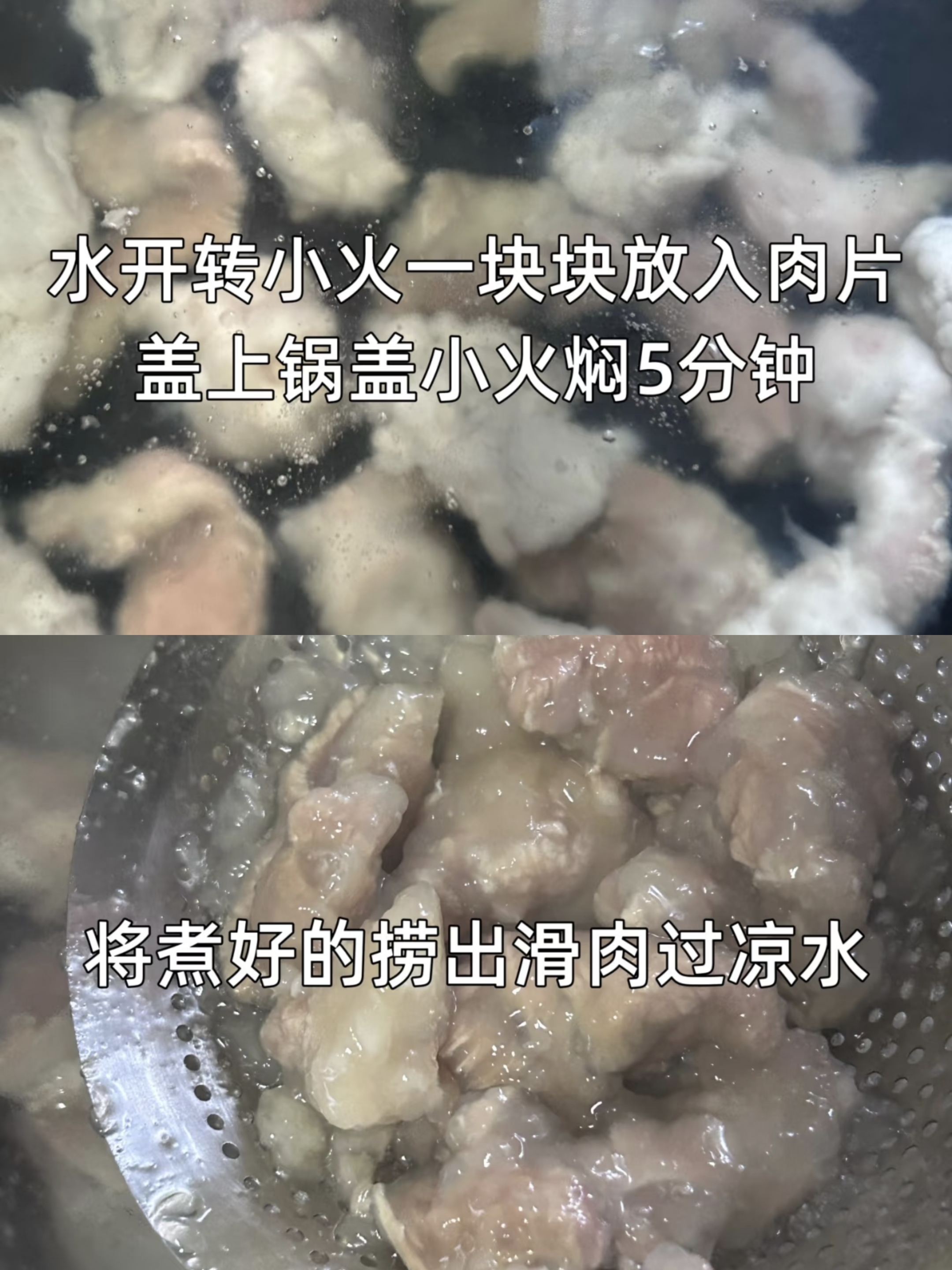 煮制滑肉要讲究火候,锅中水烧开后转小火,保持微微沸腾的状态,将裹好粉糊的肉片一片片轻轻放入锅中,避免粘连。盖上锅盖焖煮五分钟,待肉片慢慢浮起,粉糊变得透明透亮,便说明已经熟透。捞出的肉片立刻放入凉水中过一遍,滚烫的肉片遇冷瞬间收缩,表面多余的淀粉被带走,口感变得更加爽滑,汤汁也会更清爽不浑浊,这一步是让滑肉口感升级的小秘诀。