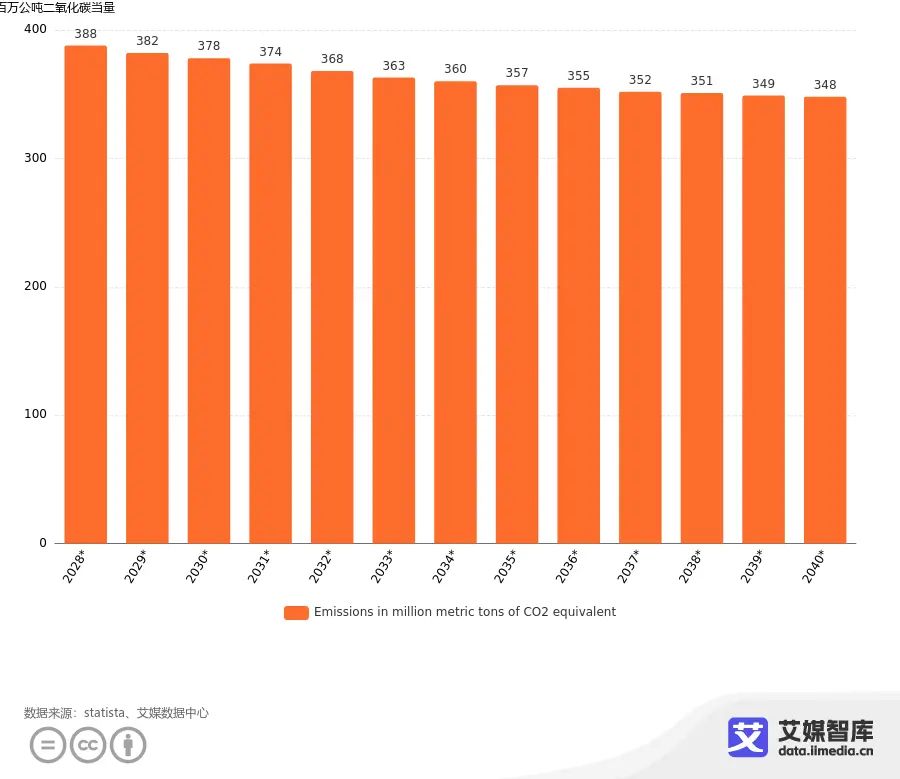 艾媒数据中心(data.iimedia.cn)显示,英国温室气体排放量呈现逐年下降的趋势。从2028年到2040年,预测的排放量分别为388百万公吨、382百万公吨、378百万公吨、374百万公吨、368百万公吨、363百万公吨、360百万公吨、357百万公吨、355百万公吨、352百万公吨、351百万公吨、349百万公吨和348百万公吨二氧化碳当量。