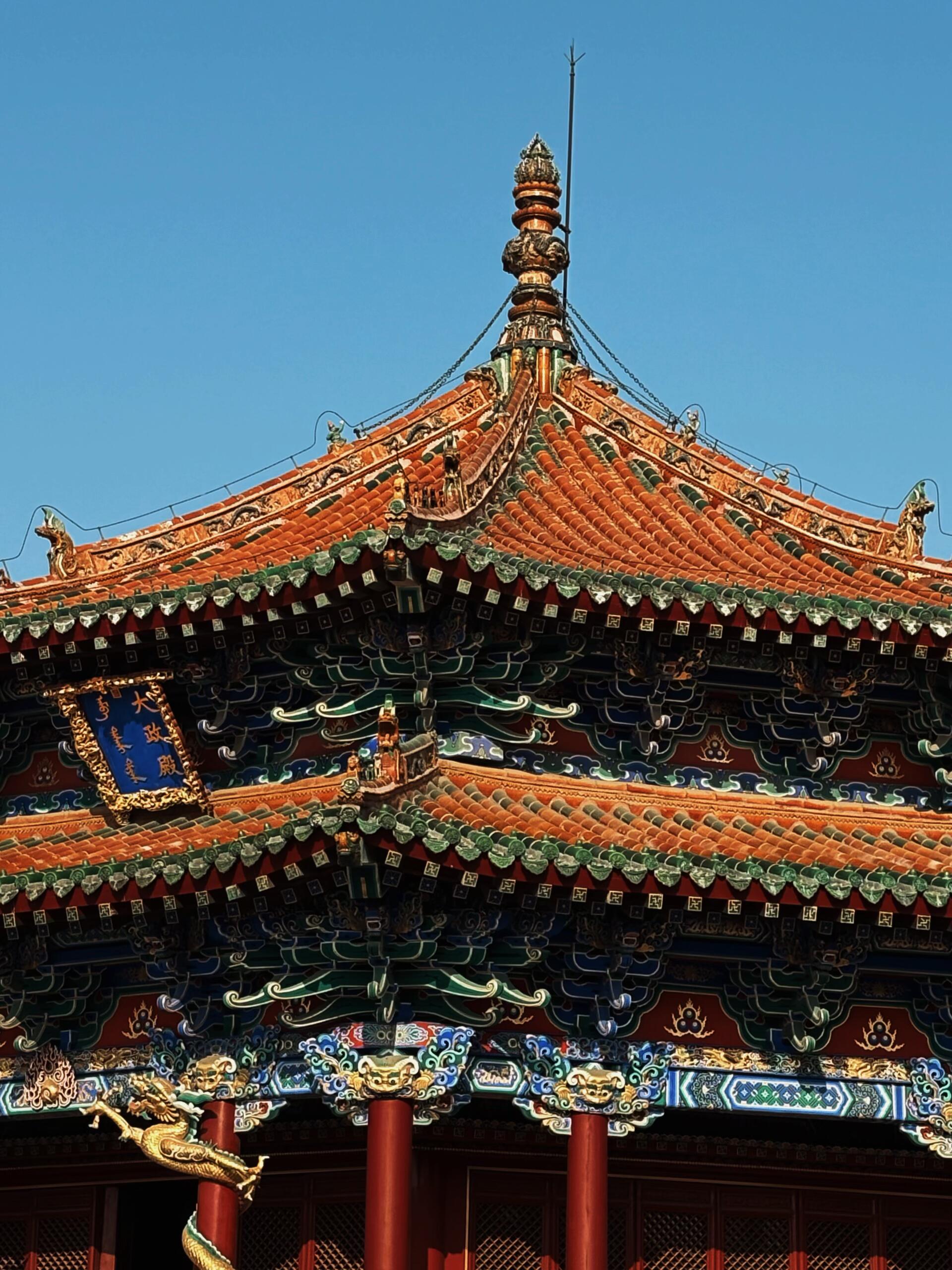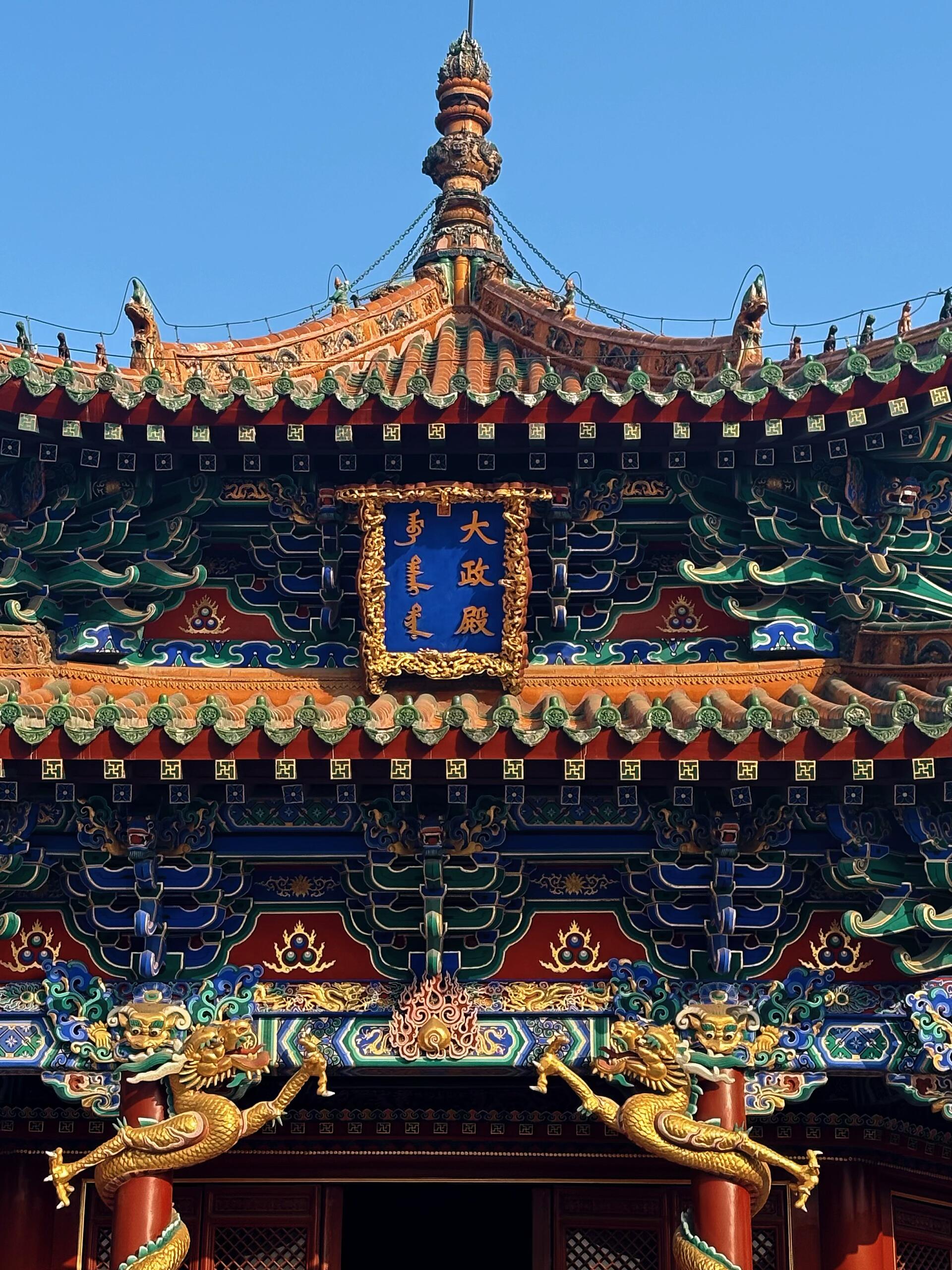 大政殿的建筑风格更是一绝。它是典型的八角攒尖顶,顶上铺满了黄色的琉璃瓦,八条屋脊上装饰着各种走兽,最顶端是一个巨大的相轮,这又带着浓浓的藏传佛教色彩。而在殿身的木构上,你又能看到汉族建筑的斗拱和梁架。这种汉、满、蒙、藏多种文化的大杂烩,没有丝毫的违和感,反而显得霸气十足。它在告诉你:我们满人不讲究你们汉人的繁文缛节,我们就是要把我们崇拜的喇嘛教、我们熟悉的帐篷形制(大政殿的造型就像一个放大的八角帐篷)和你们的砖瓦技术揉在一起,这就是我们的江山。