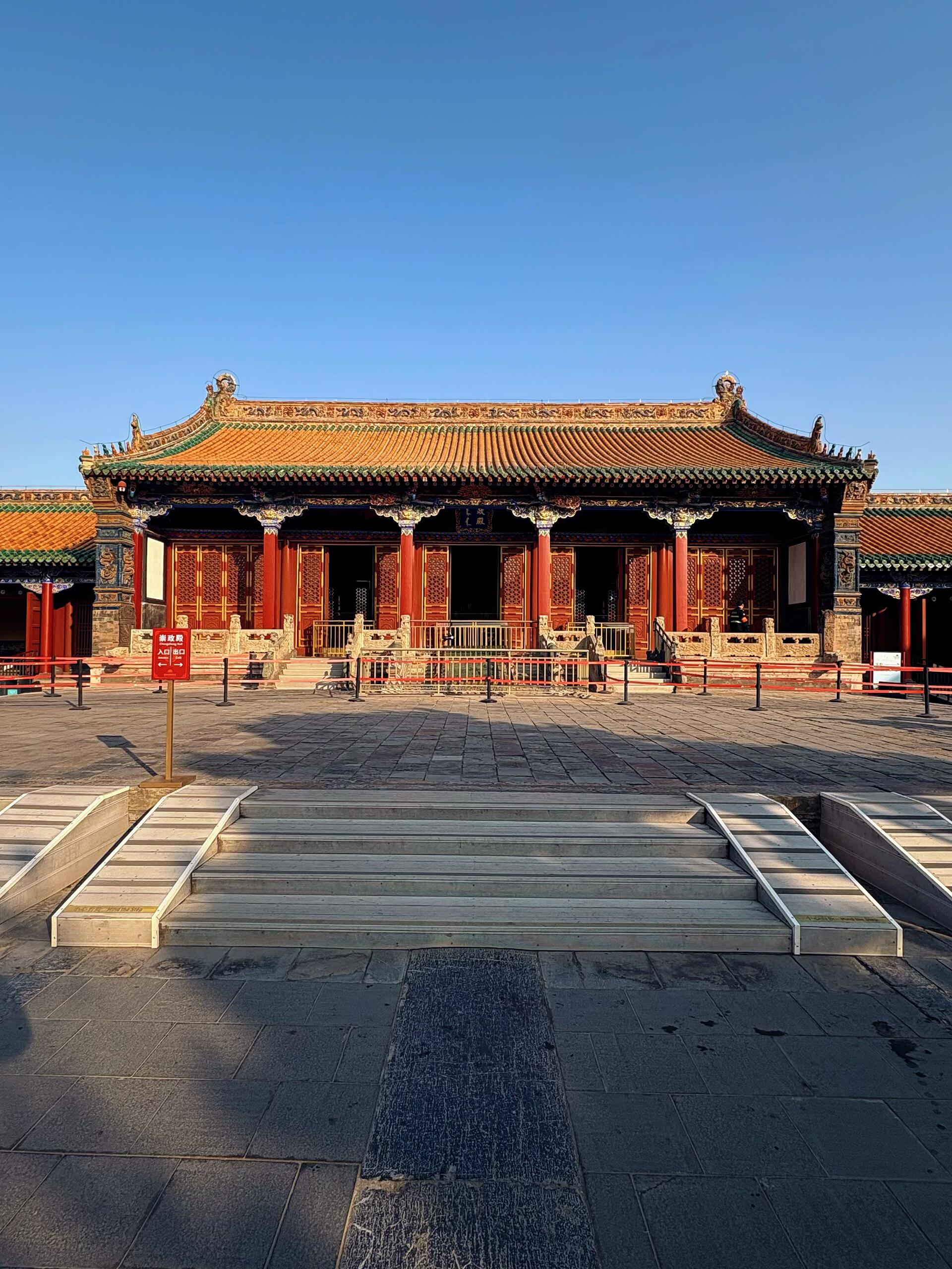 穿过东路,来到中路,画风突变。这里是皇太极时期修建的,明显开始向汉族的礼制靠拢了。大清门、崇政殿、凤凰楼、清宁宫,一条中轴线隐约可见。崇政殿是皇太极日常办公的地方,也就是所谓的“金銮殿”。虽然它的规模远不如北京的太和殿宏大,但它的细节却非常耐看。特别是殿顶的琉璃瓦,使用的是黄琉璃瓦绿剪边,这种配色在北京故宫是很少见的,透着一种关外特有的清新和活泼。