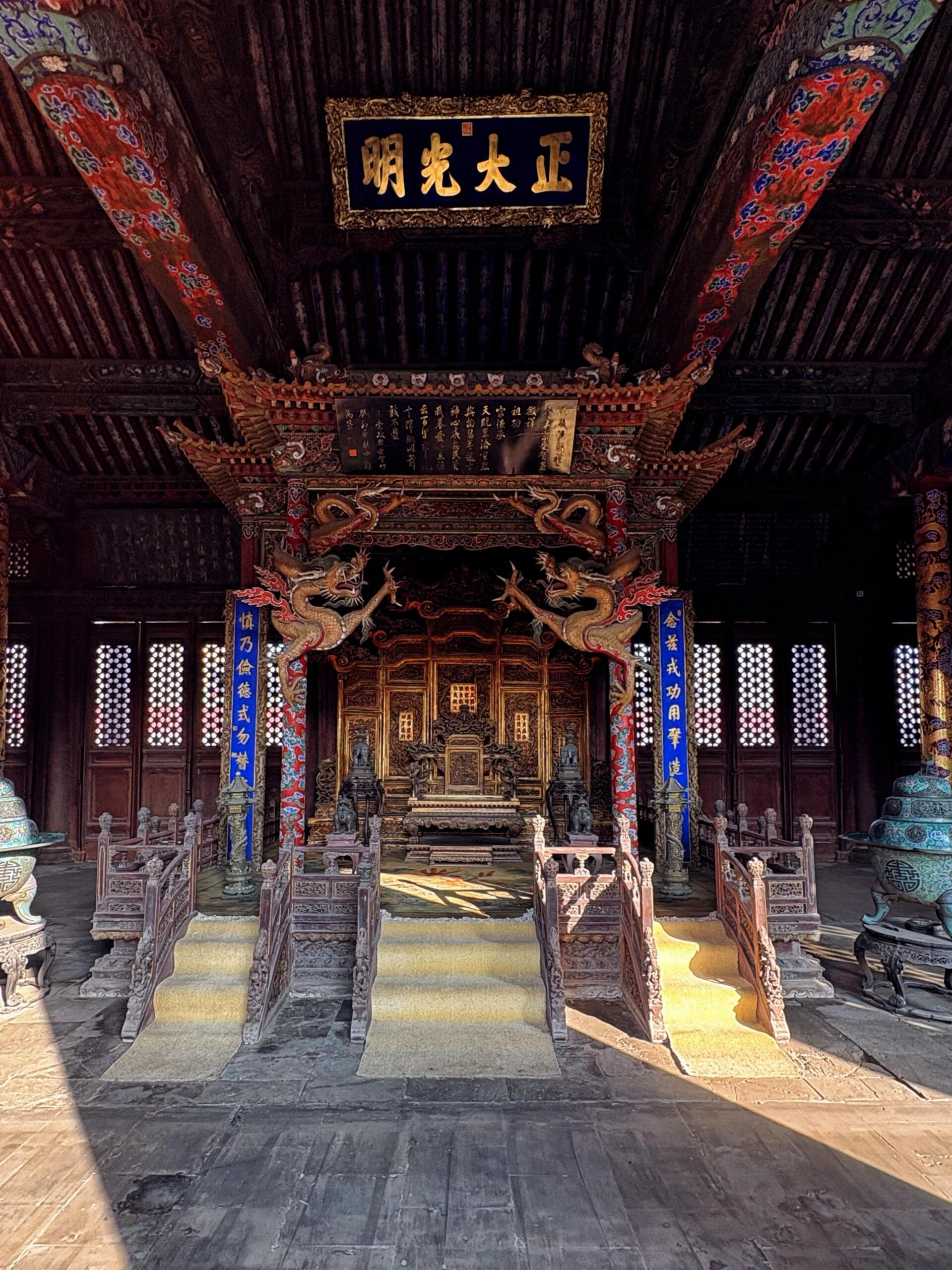 走进崇政殿,你会发现它的内部空间并不高大空旷,反而显得有些紧凑温暖。这里没有北京故宫那种让人说话都不敢大声的阴森感。皇太极当年就是在这里,调兵遣将,征服朝鲜,统一蒙古,甚至在这里接见了传教士汤若望。正是在这座大殿里,清朝完成了从一个地方政权向大一统帝国的思想转变。而在崇政殿后面的凤凰楼,曾是当年沈阳城的最高建筑,“凤楼晓日”是著名的盛京八景之一。站在楼上,你可以俯瞰整个沈阳城,那种君临天下的感觉,想必让皇太极这位野心勃勃的皇帝十分受用。