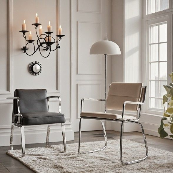 金属材质的轻巧特性,如黑色金属壁挂式烛台、镀铬饰面椅子等,为家居带来轻盈和精致感。
