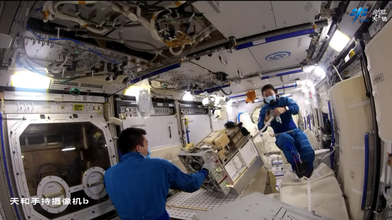 再来看航天员们在工作时的画面。蔡旭哲给出的核心舱全景画面,也是整洁得让人惊叹。除了必要的任务线路和仪器外,其他地方都保持得高度整洁。这简直就是太空里的“五星级酒店”啊!