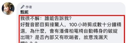 随后甄妮怀疑节目内有“吹哨人”,泄露黑幕,揭示潘玮柏座椅问题。潘玮柏座椅问题是指在某期节目中,潘玮柏双手抱在一起,但椅子自动转动,尽管他未触碰按钮。这一画面被网友截图并广为传播,引发了网友们的质疑和调侃。