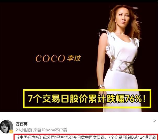 28日,背后公司星空华文的股价继续暴跌,七天内累跌77%,市值蒸发380亿港元。星空华文是《中国好声音》的母公司,也是国内最大的综艺节目制作公司之一。该公司曾经推出过《这!就是街舞》、《这!就是铁甲》等多档热门节目,并在港股上市。