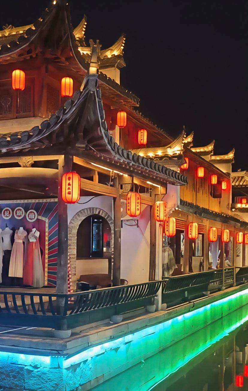 诱人的夜景醉人心扉,这是水镇里面的长廊,灯光打开以后,又是呈现出不一样的风采,小编沿着小石板路前行,历经岁月的道路两旁,自然都是错落有致的徽派建筑了,时不时还可以看见很多游客拿着手机在拍照取景哦,各自谈风说笑。