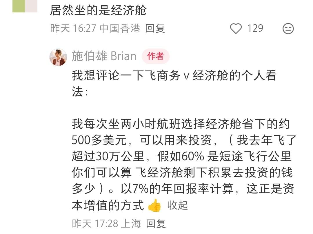 有网友就在下面评价:“居然坐的经济舱。”很快,施伯雄也在下面回复了网友,讲了自己对商务和经济舱的个人看法。