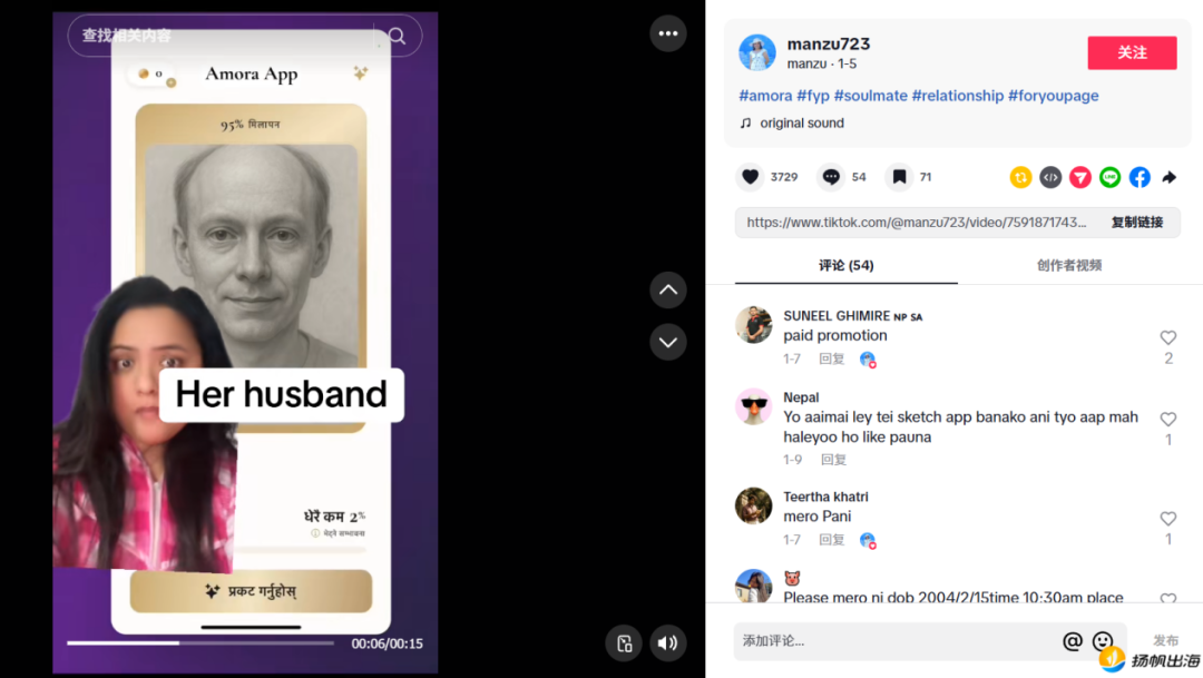 同时,结合站内用户发布的推广视频,甚至能看到比较小众的尼泊尔语用户的使用场景,该视频点赞量超3700+。除了灵魂伴侣画像之外,还宣传了应用能预测未来家庭的功能。