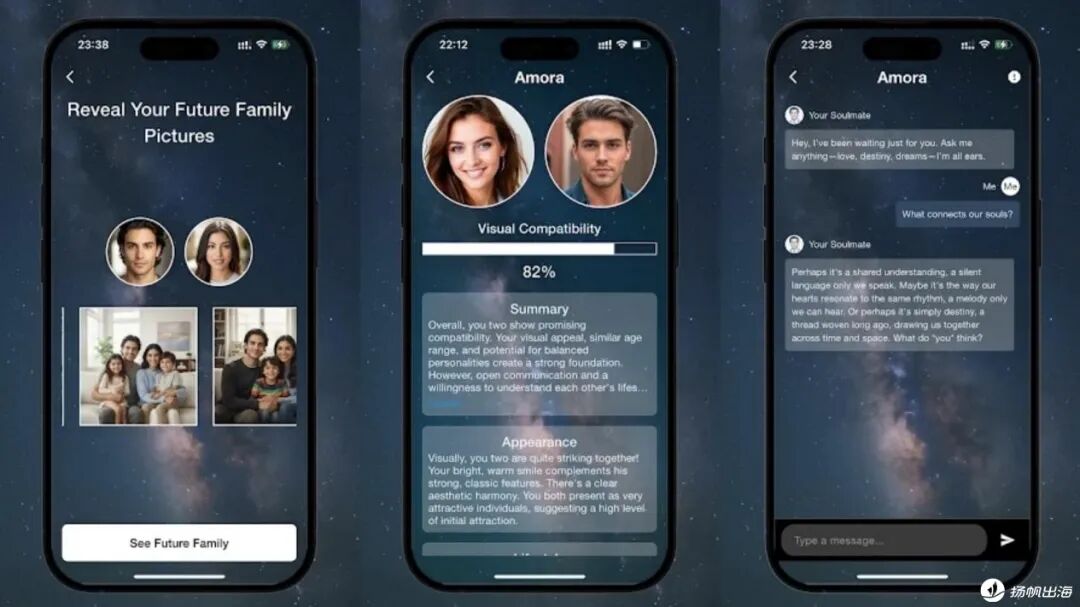 Starla将AI交互能力用于“解读命运”,让用户与AI进行占星方面的预测交流。而Amora做了一个巧妙的包装,将“灵魂伴侣”画像功能与AI交互相结合,试图让这个尚未出现的人,先一步“开口说话”。