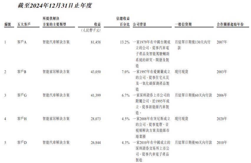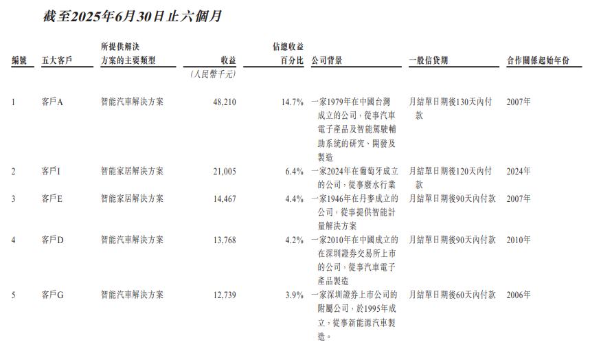 截至2022年、2023年、2024年12月31日止各個年度及截至2025年6月30日止六個月,各期间五大客户产生的营收分别为1.49亿元、1.78亿元、2.21亿元及1.1亿元,分别占同期总营收的39.5%、38.0%、35.7%及33.6%。
