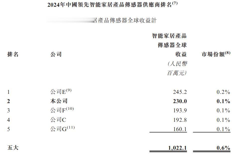 中国智能家居产品传感器TOP 5总营收约为10.22亿元,占全球市场份额0.6%。