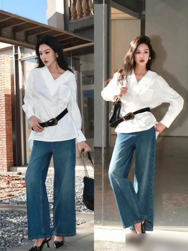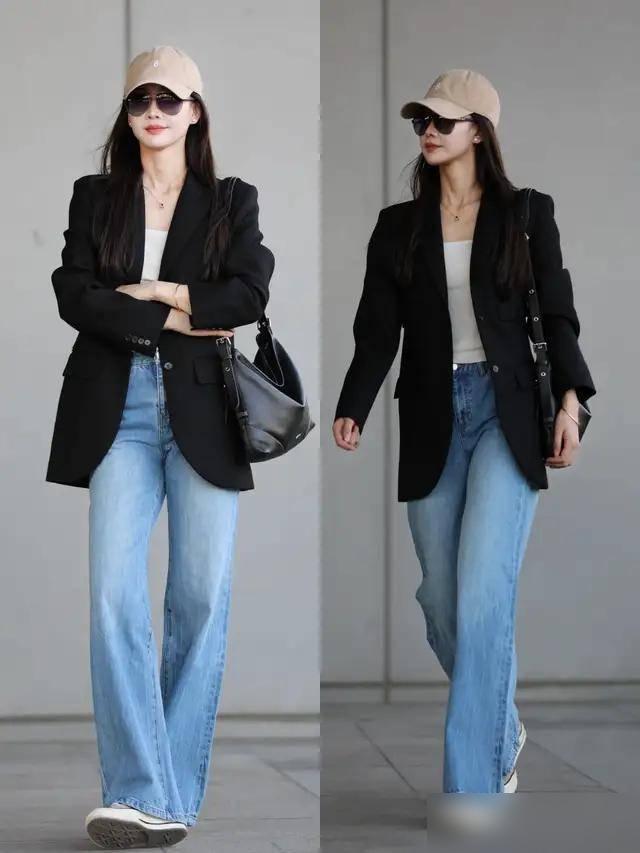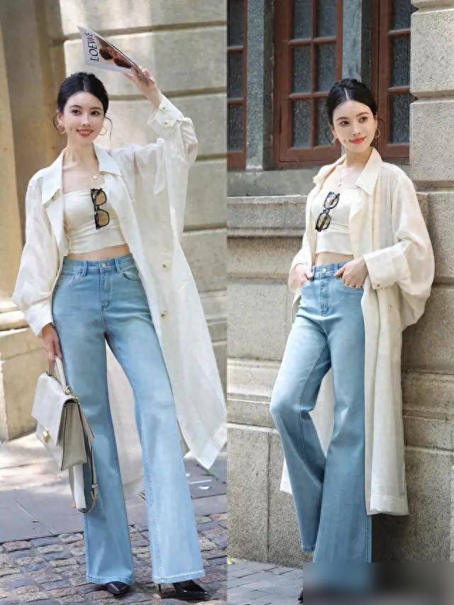 关键还是得选对版型。太紧或太肥都不行,直筒微喇最不挑人。颜色选正蓝或浅蓝,好搭配。
