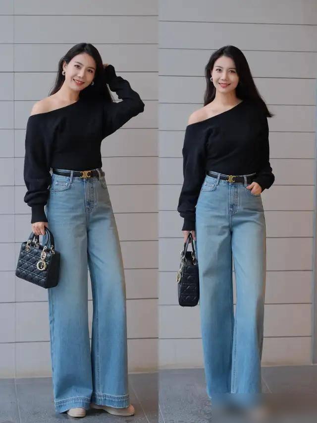 微胖或者腿粗也不用愁。直筒阔腿的牛仔裤能遮肉,选垂感好的料子,利落不拖沓。