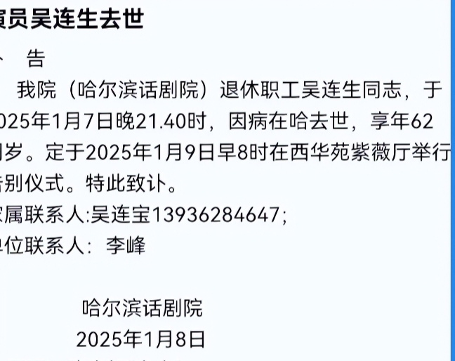 随后,吴连生所在的单位【哈尔滨话剧院】也发了讣告,证实了他离世的消息。