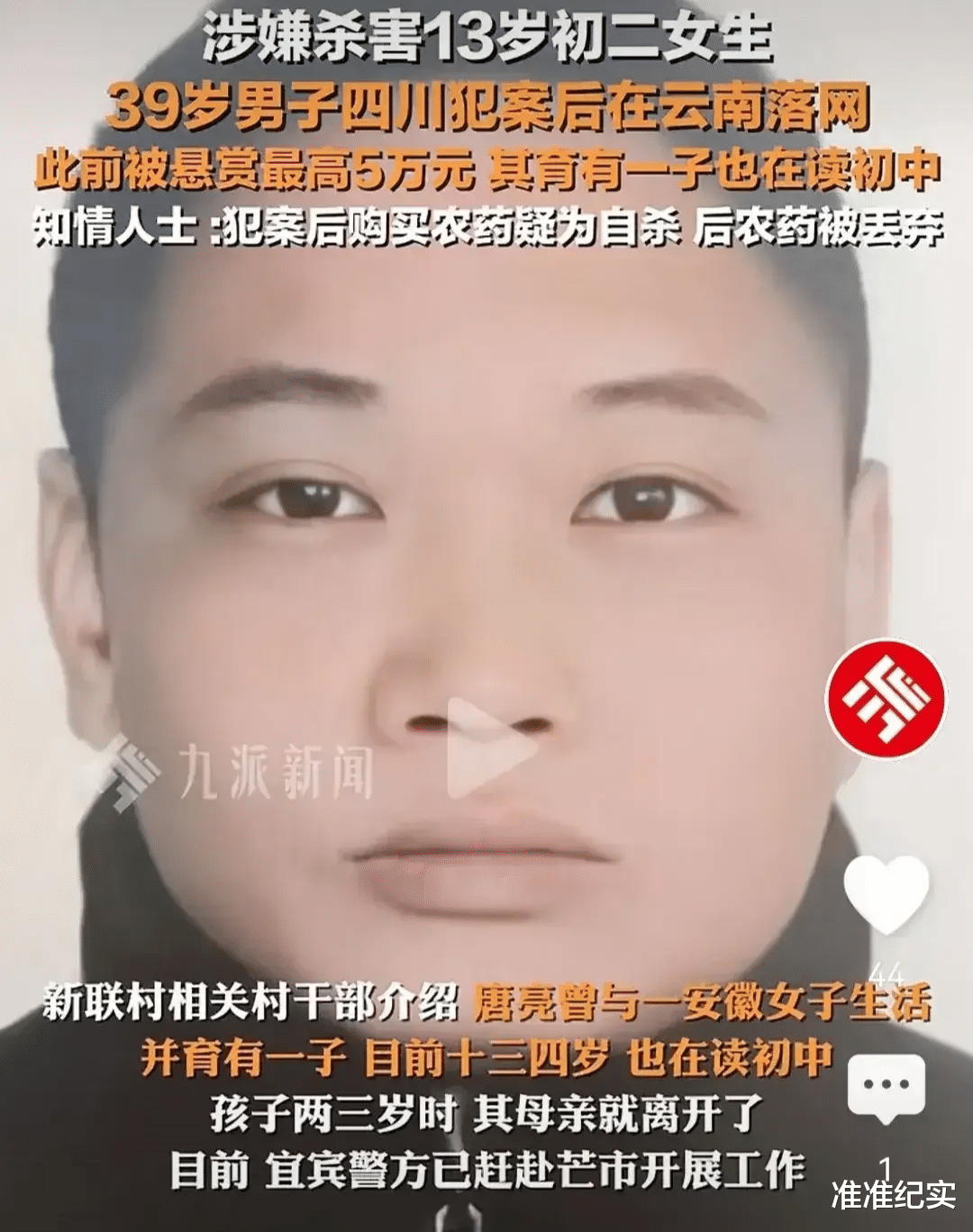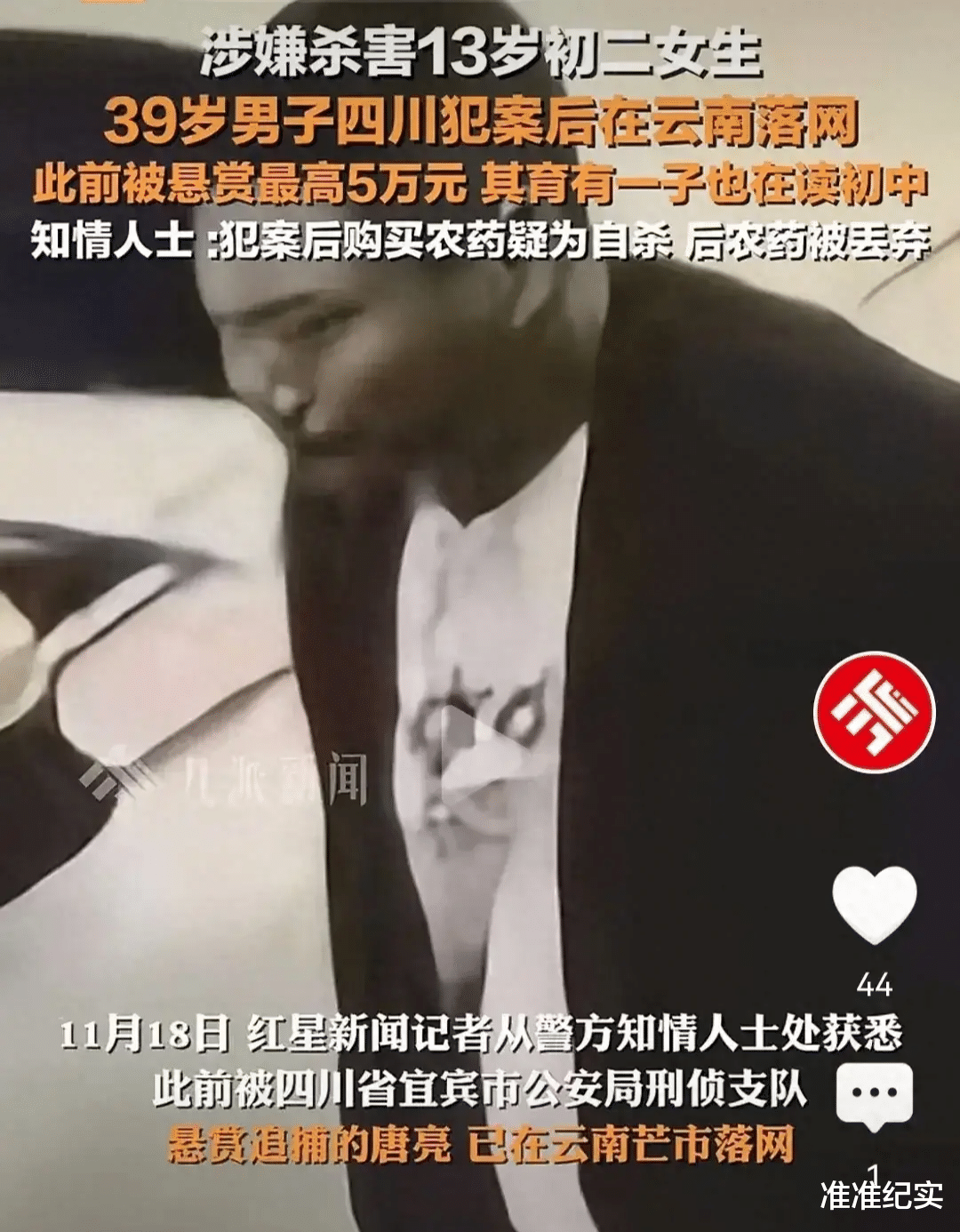 涉嫌杀害四川长宁县13岁女生周某某的39岁男子唐亮,在云南芒市被警方成功抓获。